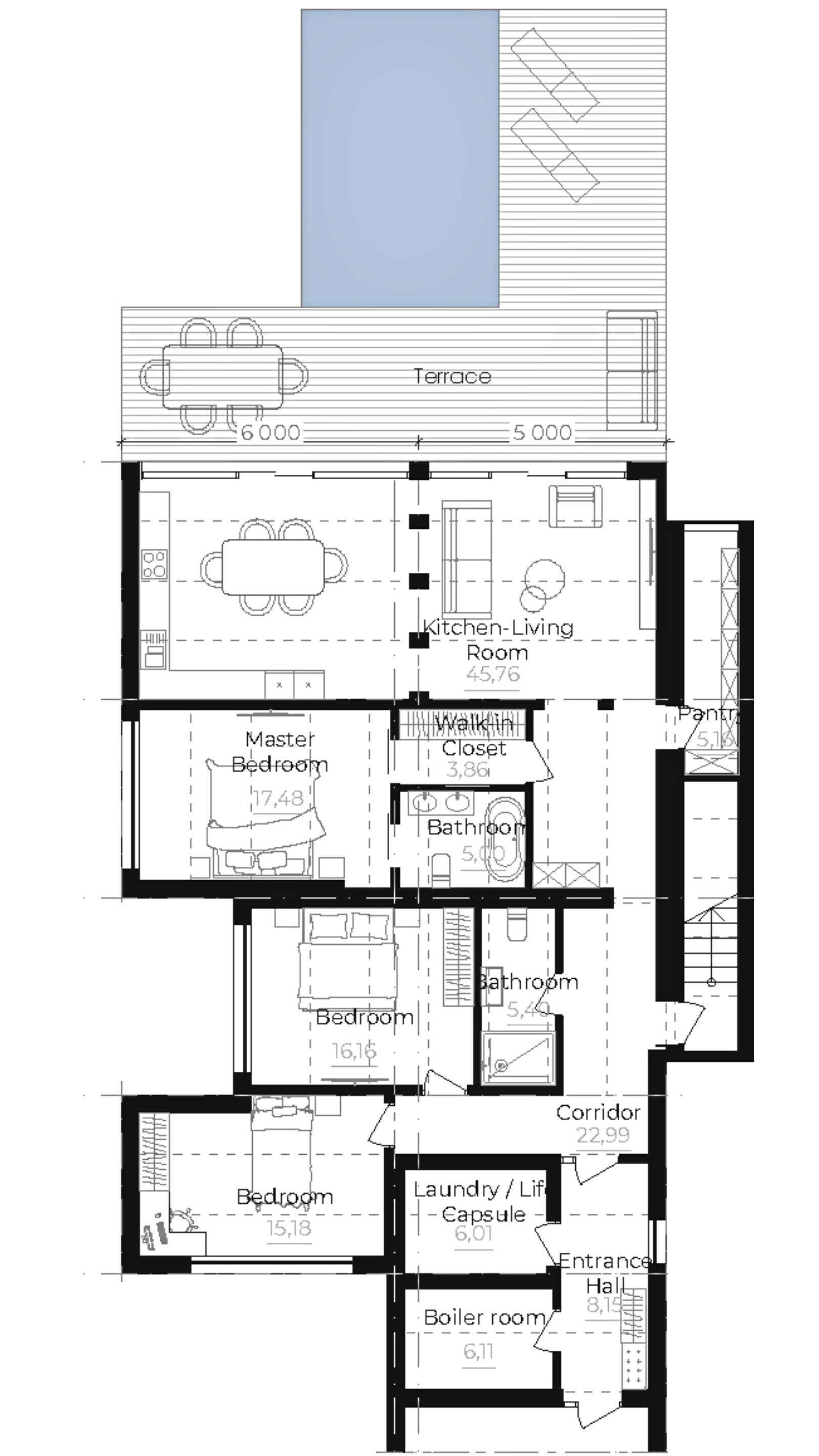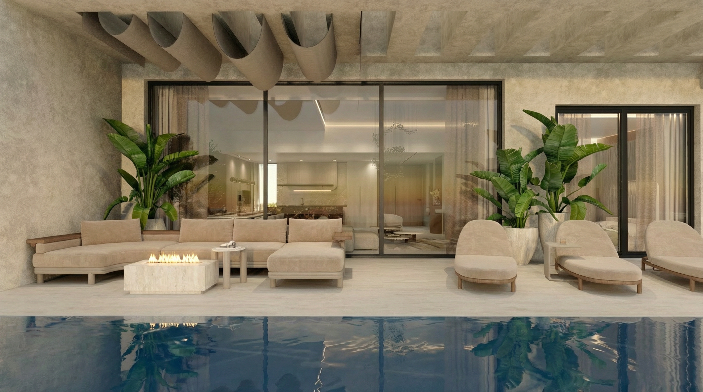 top view 3d floor plan based exactly on provided architectural layout precise room proportions and zoning preserved modern minimalistic beige interior style soft warm neutral palette beige sand light taupe cream open kitchen living area with dining table and sofa master bedroom with walk in closet and bathroom two additional bedrooms bathrooms fully furnished terrace with outdoor dining set and lounge chairs clean modern furniture high end photorealistic materials wood stone fabric soft natural daylight subtle shadows no clutter ultra realistic rendering architectural visualization style isometric top view no perspective distortion sharp details 4k global illumination calm and elegant atmosphere no walls removed layout strictly follows floor plan floor textures clearly visible wood tile zoning
