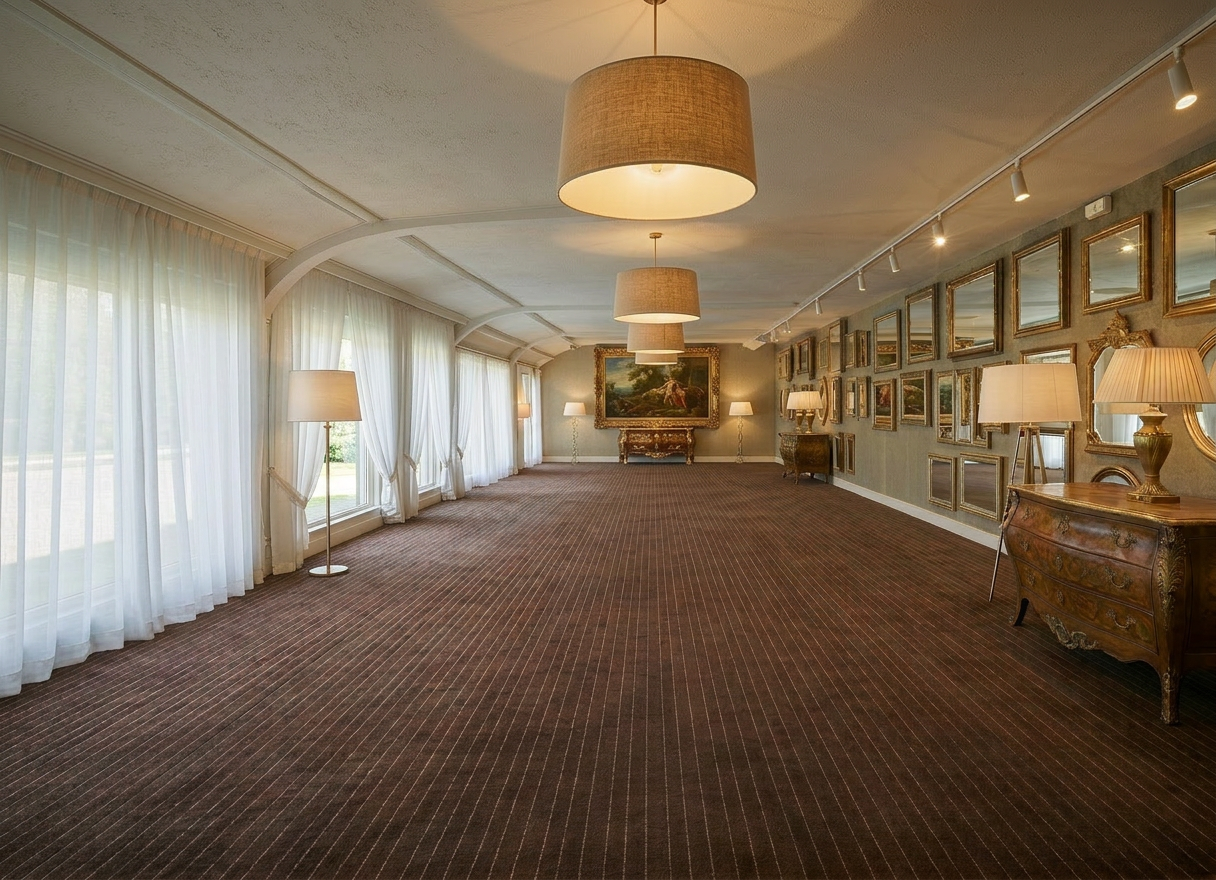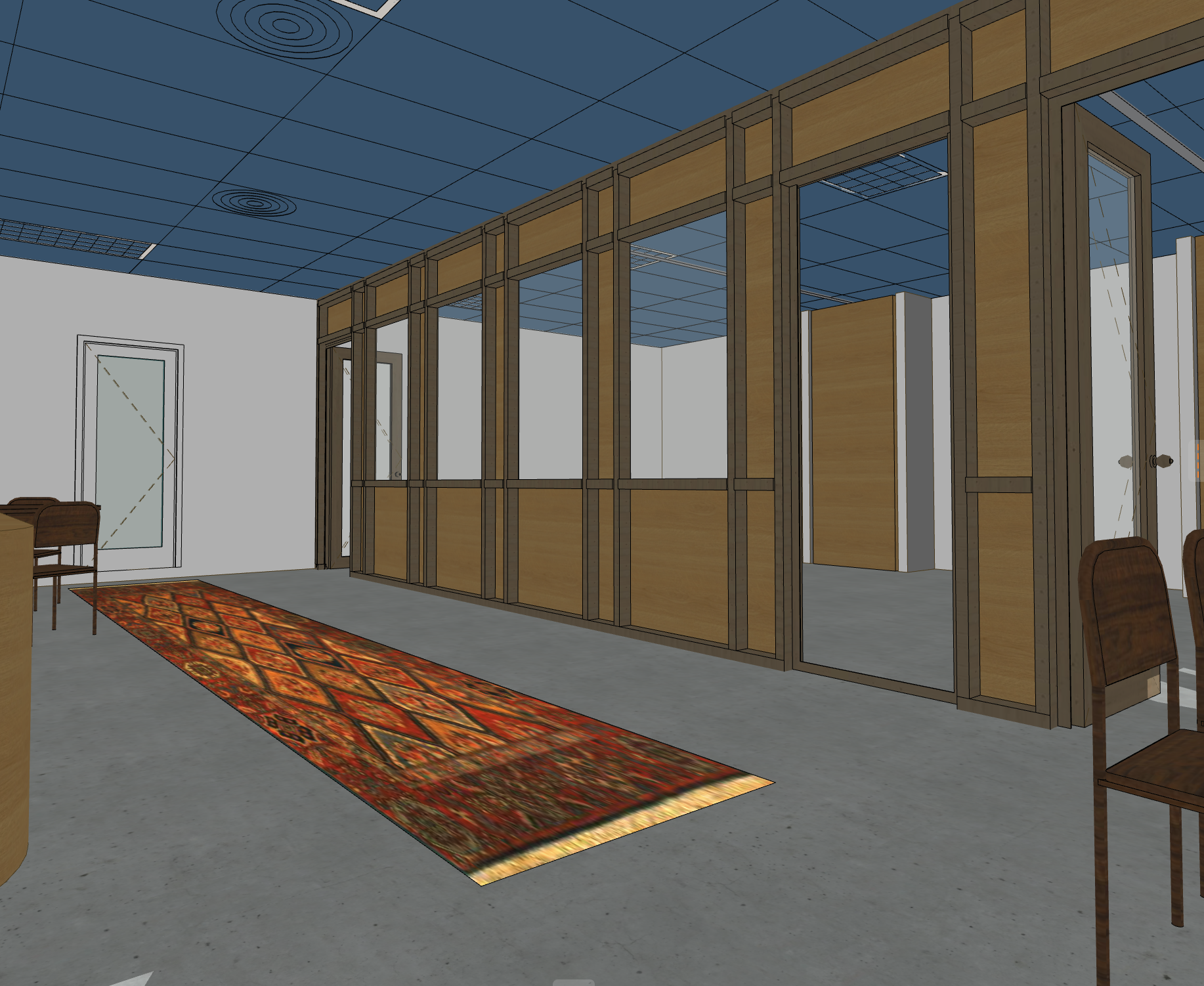 exterior shot create a beautifully rendered modern office interior with a cozy warm atmosphere use rich dark brown wood for the walls and doors giving a sense of luxury and comfort incorporate a vivid intricate persian carpet with deep reds oranges and golds on the concrete floor adding warmth and elegance set the ceiling to a calming deep blue with subtle lighting for a peaceful ambiance ensure the white walls brighten the space while maintaining a modern aesthetic add natural light filtering through glass panels creating a harmonious and inviting environment