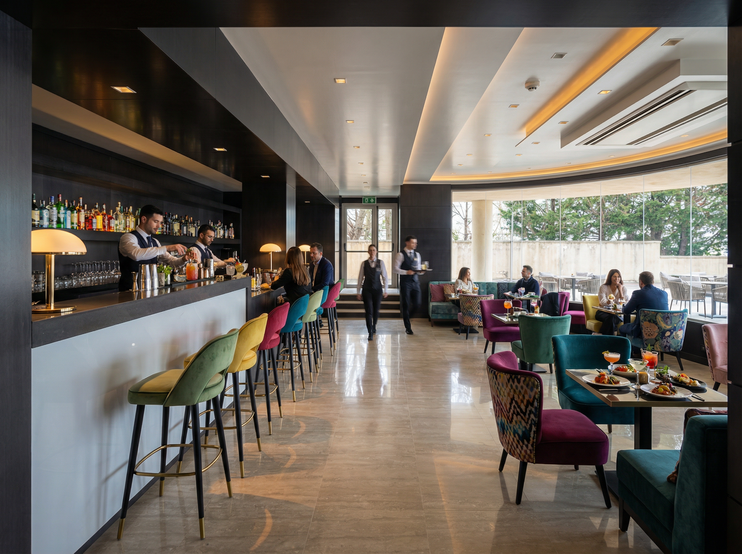 provide a photorealistic rendering keep all the elements proportions and materials as they are provide north daylight through the glass only add linear wall wash illumination at the bronze wall keep logo as is