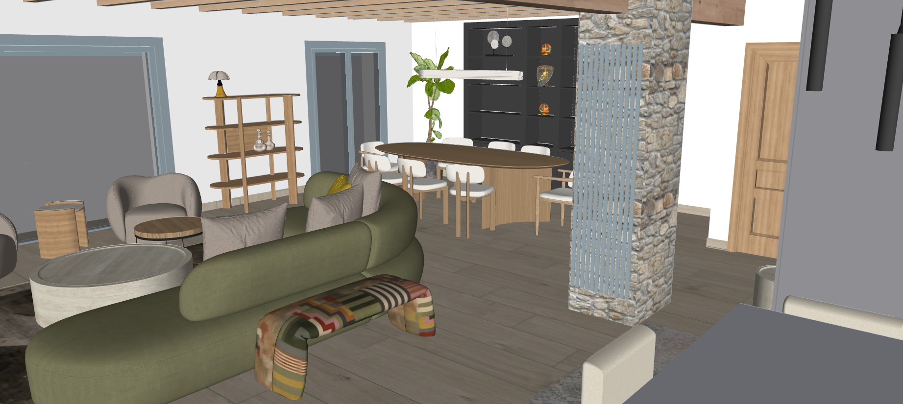 casa con vistas a las monta as nevada de andorra piso tipo parquet en madera natural claro sof con un textil verde militar techo con vigas de madera muebles en gris obscuro l mpara arriba del comedor blanca con iluminaci n c lida puertas en madera de pino natural cocina en melamina gris obscuro