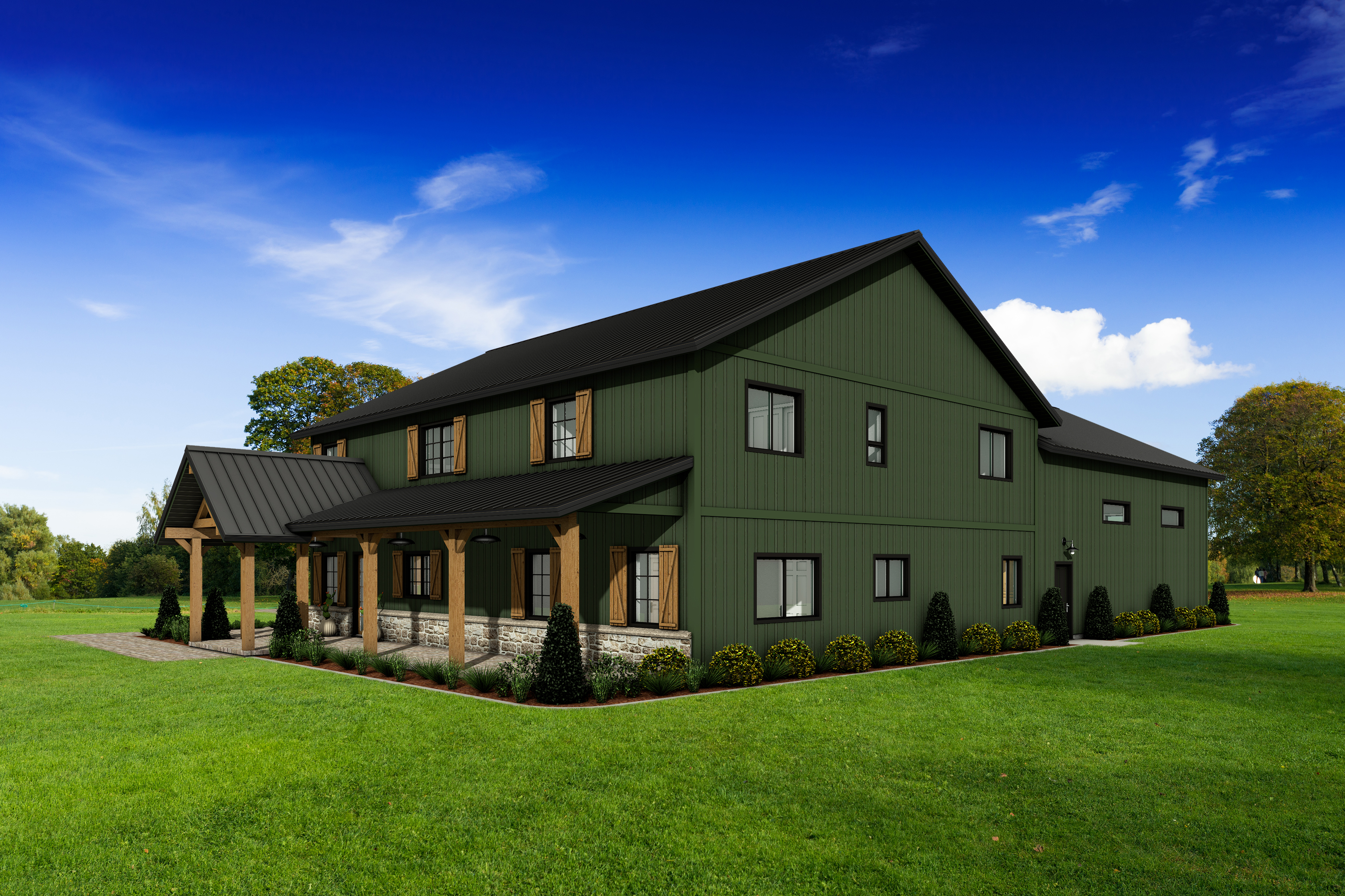 a modern two story house retain the exact structure and window arrangement patio columns rooflines foundation height and proportions exactly as shown in the reference image integrate into the terrain surround the property with a lush dense forest of mixed hardwoods add warm golden sunlight subtle dappled highlights across the siding and grass create ultra realistic lighting crisp shadows detailed textures in the siding and glass reflections and an overcast sky show only a few lights visible inside render in hyper realistic architectural visualization quality 8k resolution add a driveway tying into the the concrete garage door apron make it the fall season make the siding more of a dark forest green color with black trim
