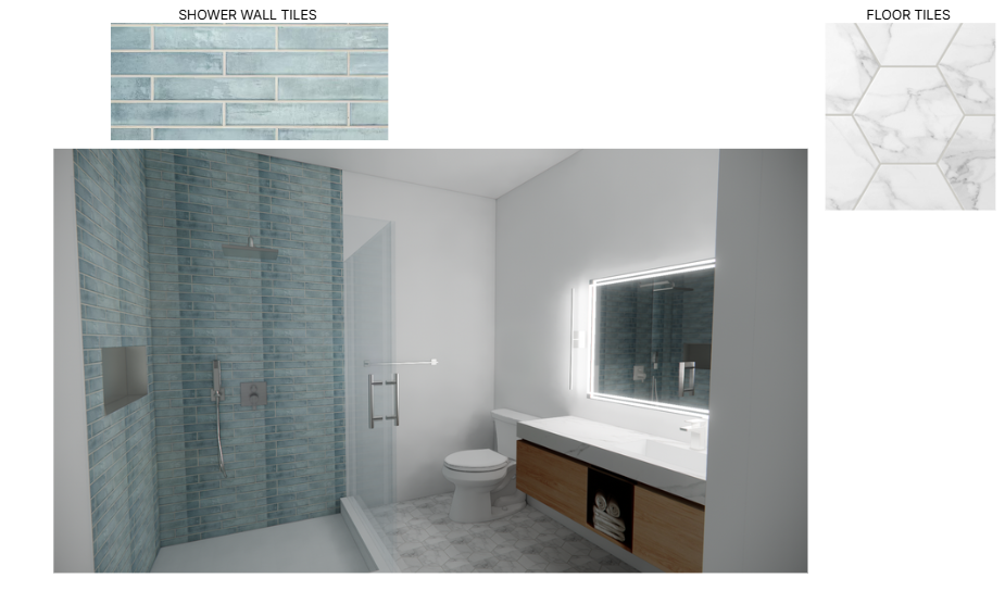 keep the bathroom layout exactly the same do not change the layout vanity mirror lighting plumbing fixtures glass niche walls or camera angle only update the materials change the shower wall tile to match the blue tile shown in the reference image color size texture and grout color change the bathroom floor tile to match the hexagon tile shown in the reference image color size and grout color make the tiles look more realistic with realistic tile texture visible grout lines slight variation in tile color natural reflections on tile realistic lighting and shadows do not change tile layout pattern bathroom layout vanity mirror lighting plumbing fixtures glass wall color the only change should be the shower wall tile and the floor tile materials make the final image look like a photorealistic rendering like a real photograph important use the reference images only for material and color do not redesign the bathroom