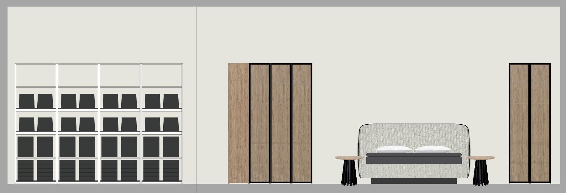 put som cabinet light in shelfes with glass doors with metal frame the wall is free standing wall in large showroom