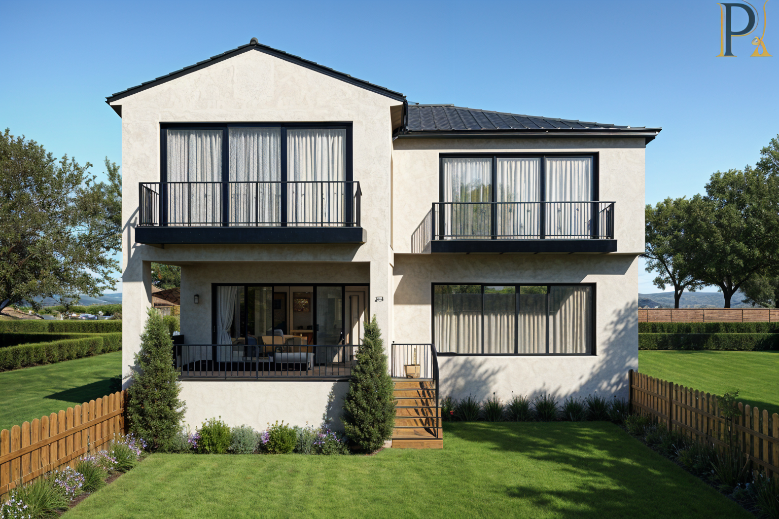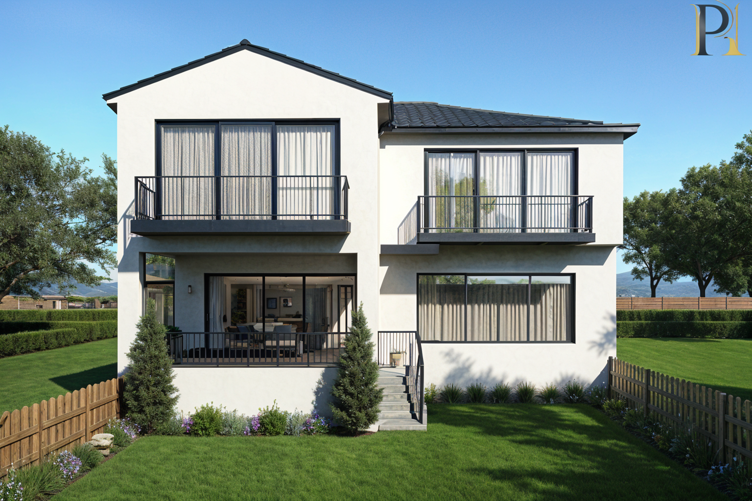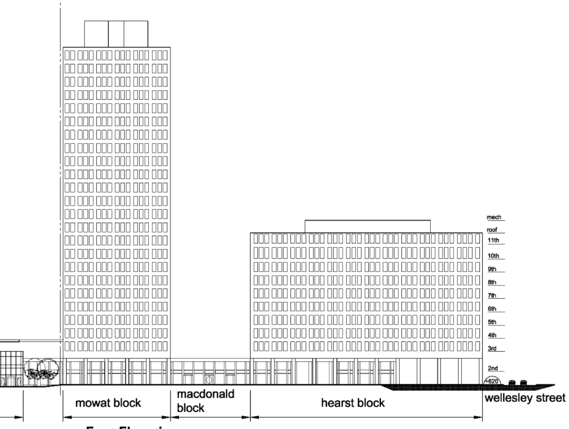 exterior elevation with the building split vertically showing the interior floors and central elevator shaft