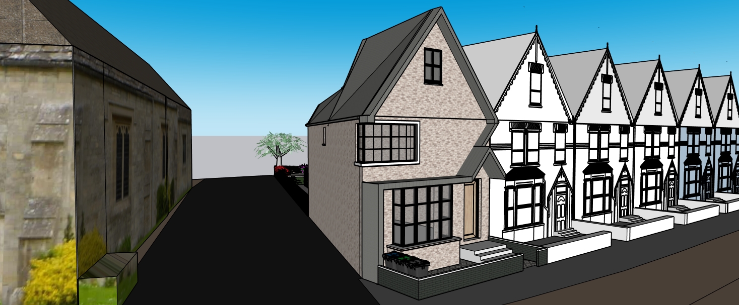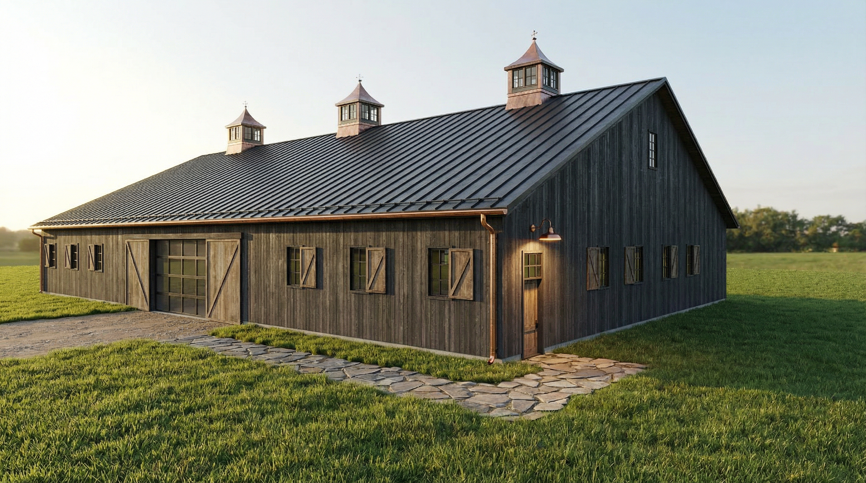 ultra realistic high resolution architectural photograph based exactly on the geometry and composition of uploaded sketchup image the main building must be focused with the clear lighting buff facing brickwork with the black frame metal roof covering and timber fence on the back standing seam metal remove any unwanted lines from the elevation all the materials in the sketch turn into realistic texture under soft light keep the environment very similar in the image make soft professional architectural style photography with no changing or adding any element highly detailed textures 4k resolution with wide angle view