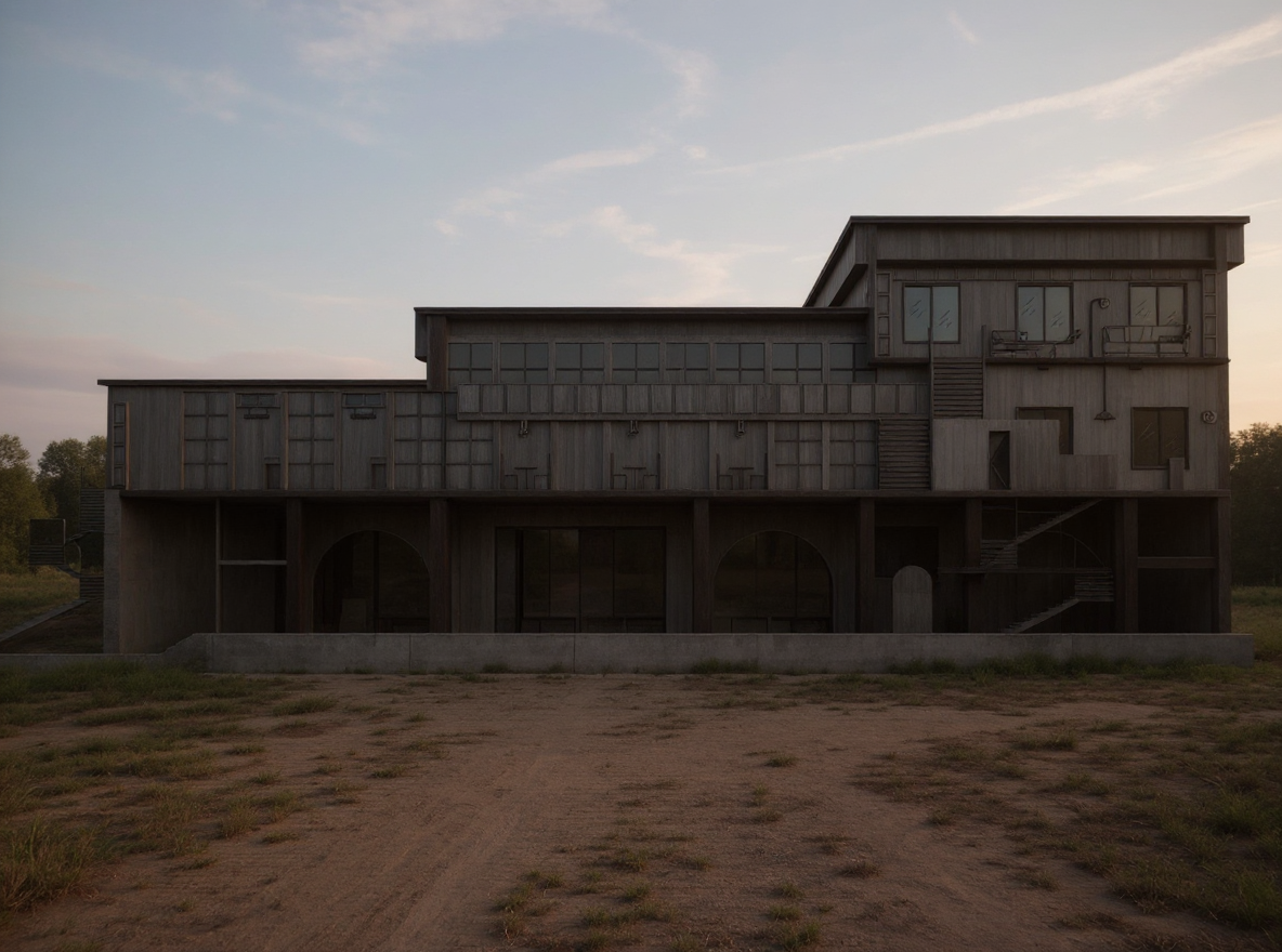 entrance of a house the floor is made of travertine the walls are limestone there is a wooden cabinet with a lamp on top floor to ceiling wooden windows from the windows you can see the patio of the house wooden beams on the ceiling a rug at the entrance the ceiling is tilted keep the original perspective of the image