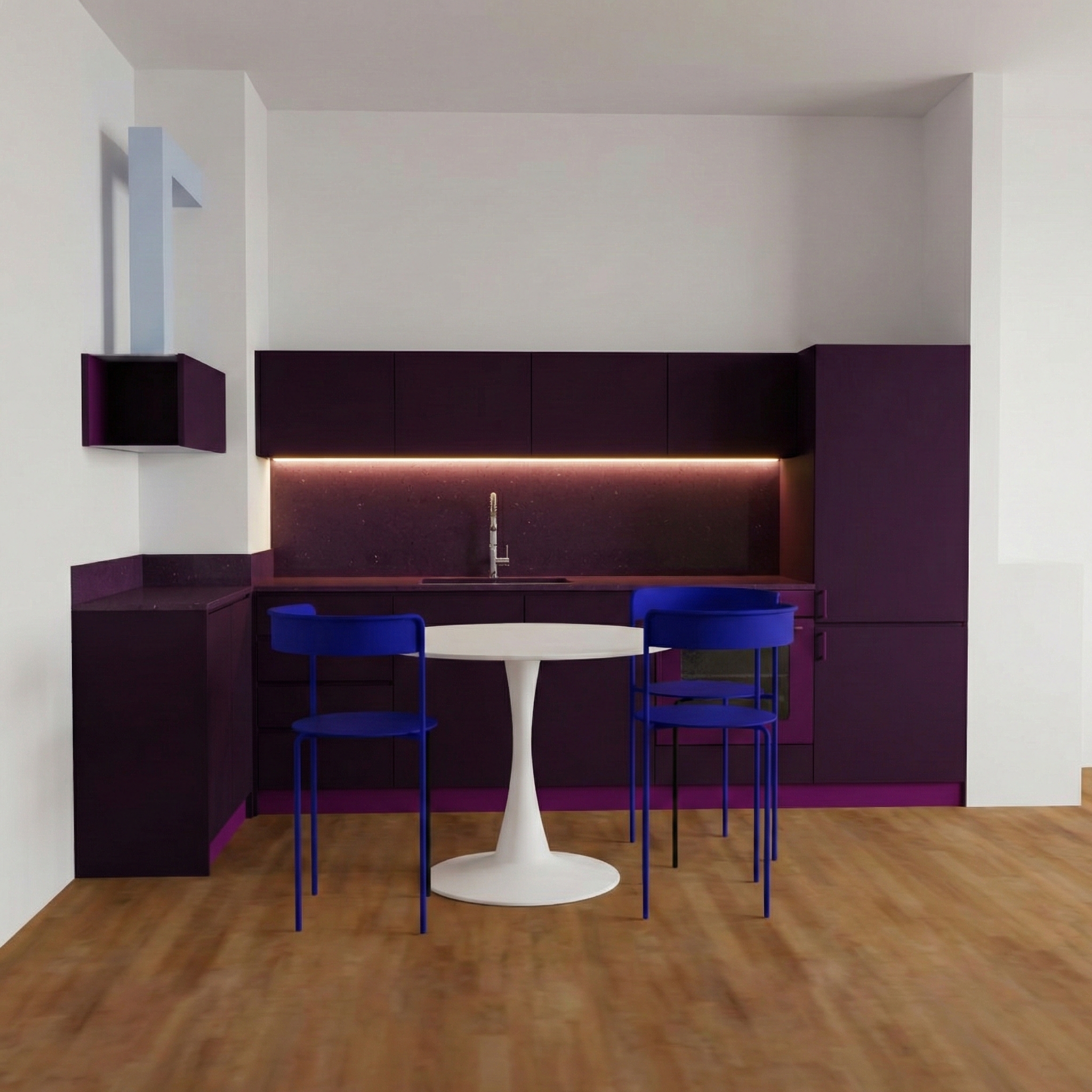 add more baby blue combination in the bottom cabinets make the fridge cabinet in mirror and the top cabinets also in mirror veneer and make the natural oak parquet the oven must be red purple color