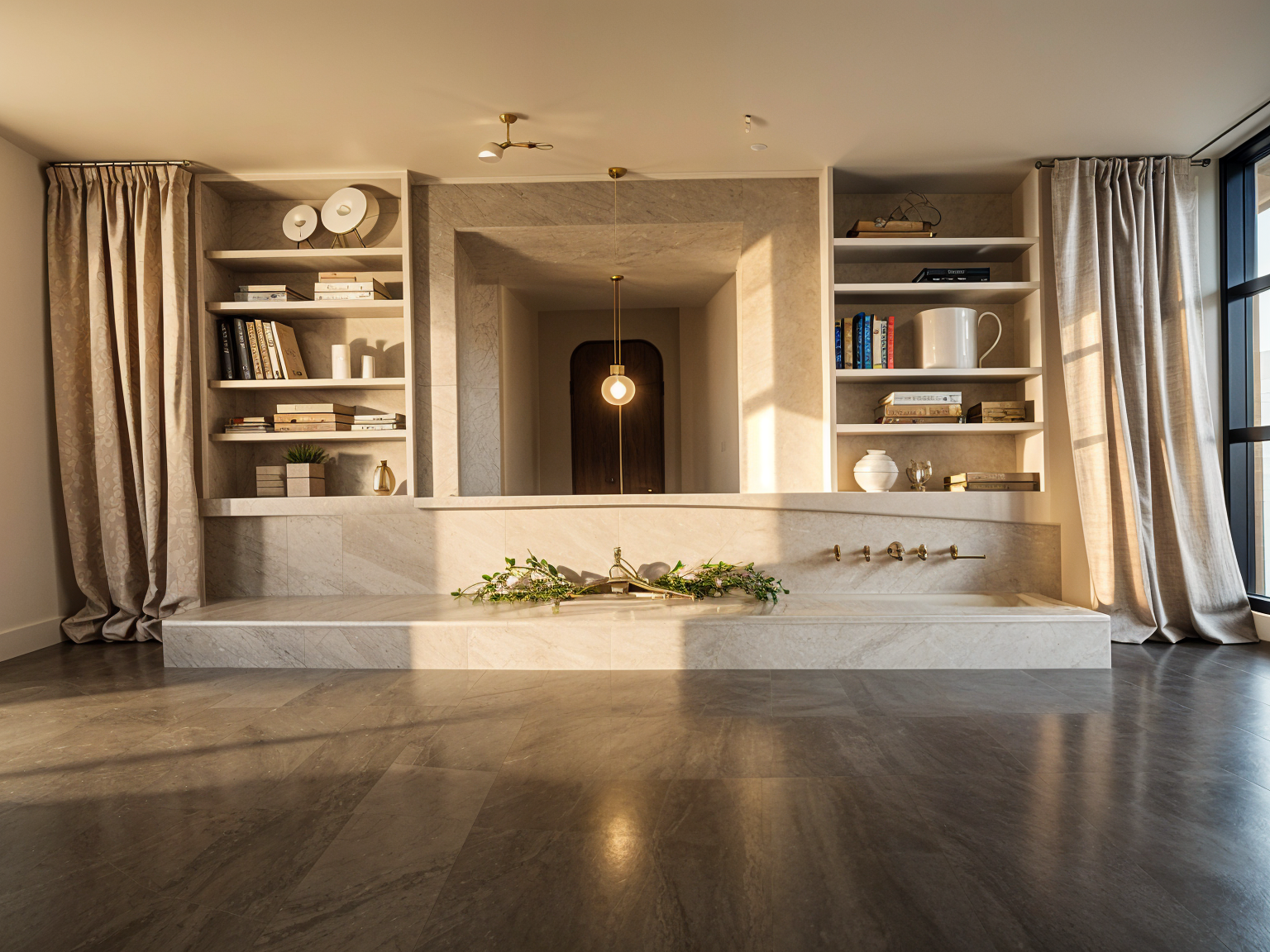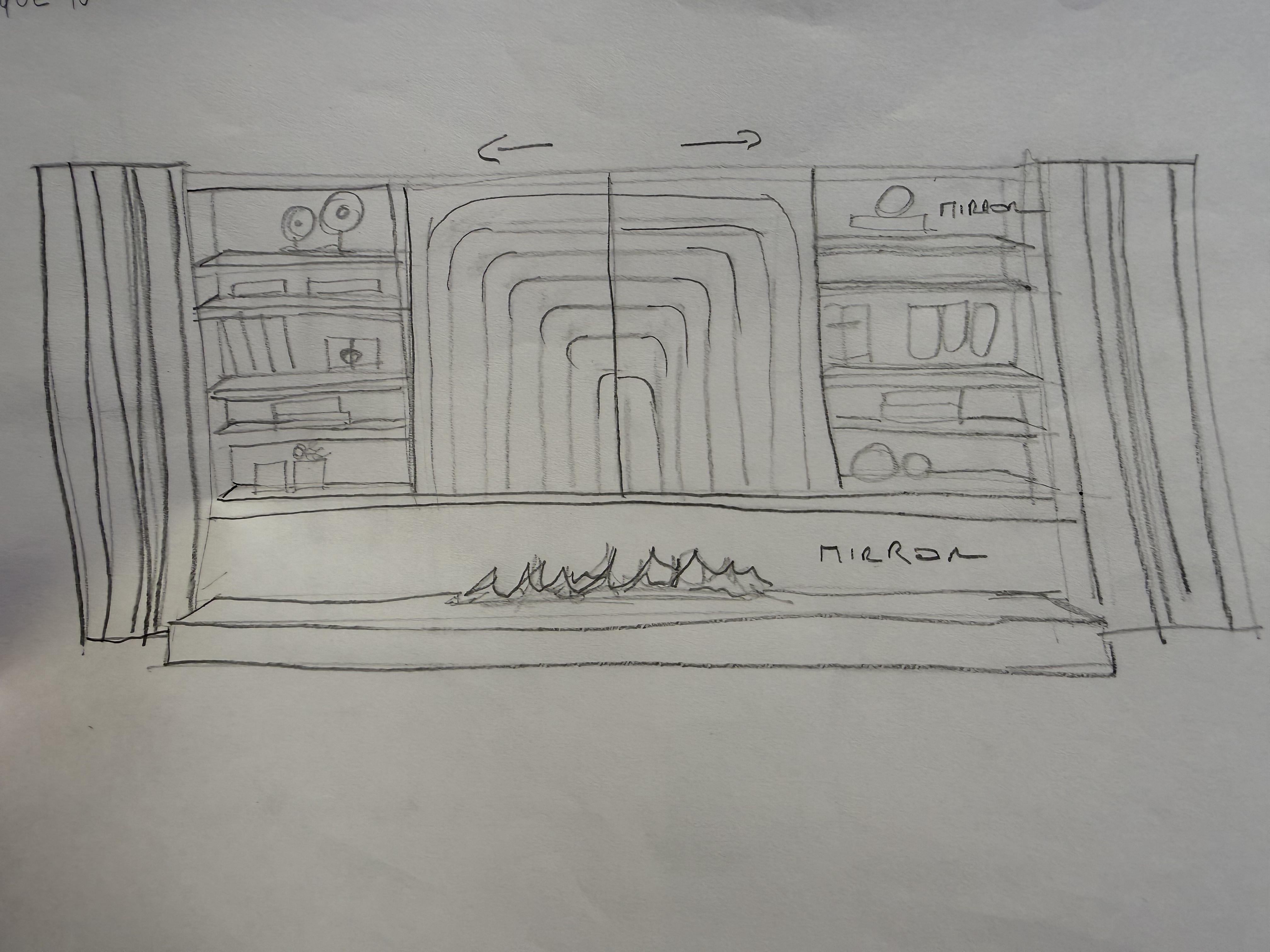 this sketch presents a symmetrical built in wall composition designed around a central architectural feature at the center there is a recessed niche framed by a series of layered rounded arches that create depth and a soft sculptural rhythm the arrows suggest that this central element may function as sliding panels or doors adding both movement and transformability to the space on both sides of the central structure there are integrated shelving units these shelves are styled with decorative objects books vases small sculptures indicating a balance between functionality and curated display the composition feels intentionally mirrored reinforcing a sense of order and calm below a long horizontal base runs across the entire width incorporating what appears to be a linear fireplace the word mirror is noted on this surface suggesting a reflective material that would amplify light and visually expand the space framing the entire installation floor to ceiling curtains on both ends soften the structure and add a layer of warmth and texture overall the design blends architectural geometry with decorative elements aiming for a refined contemporary look with a slightly sculptural almost art deco inspired central focus
