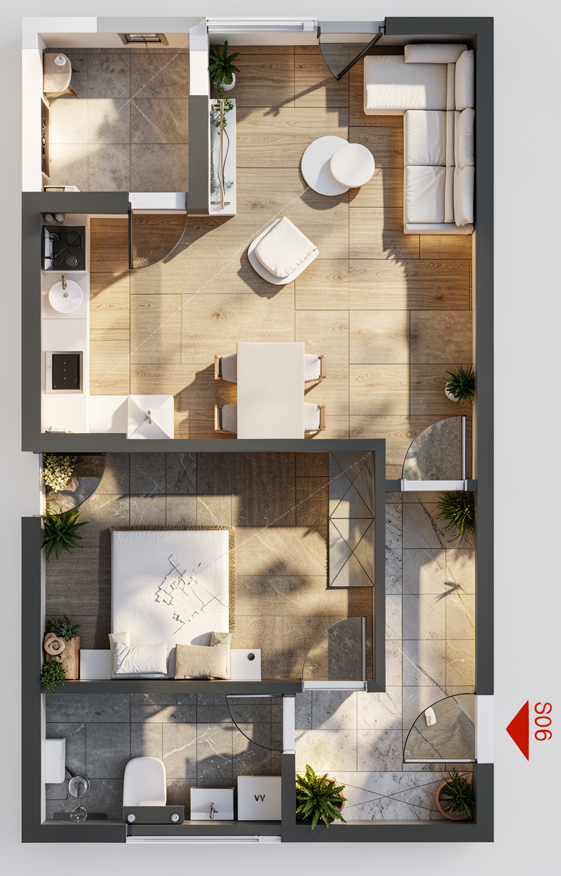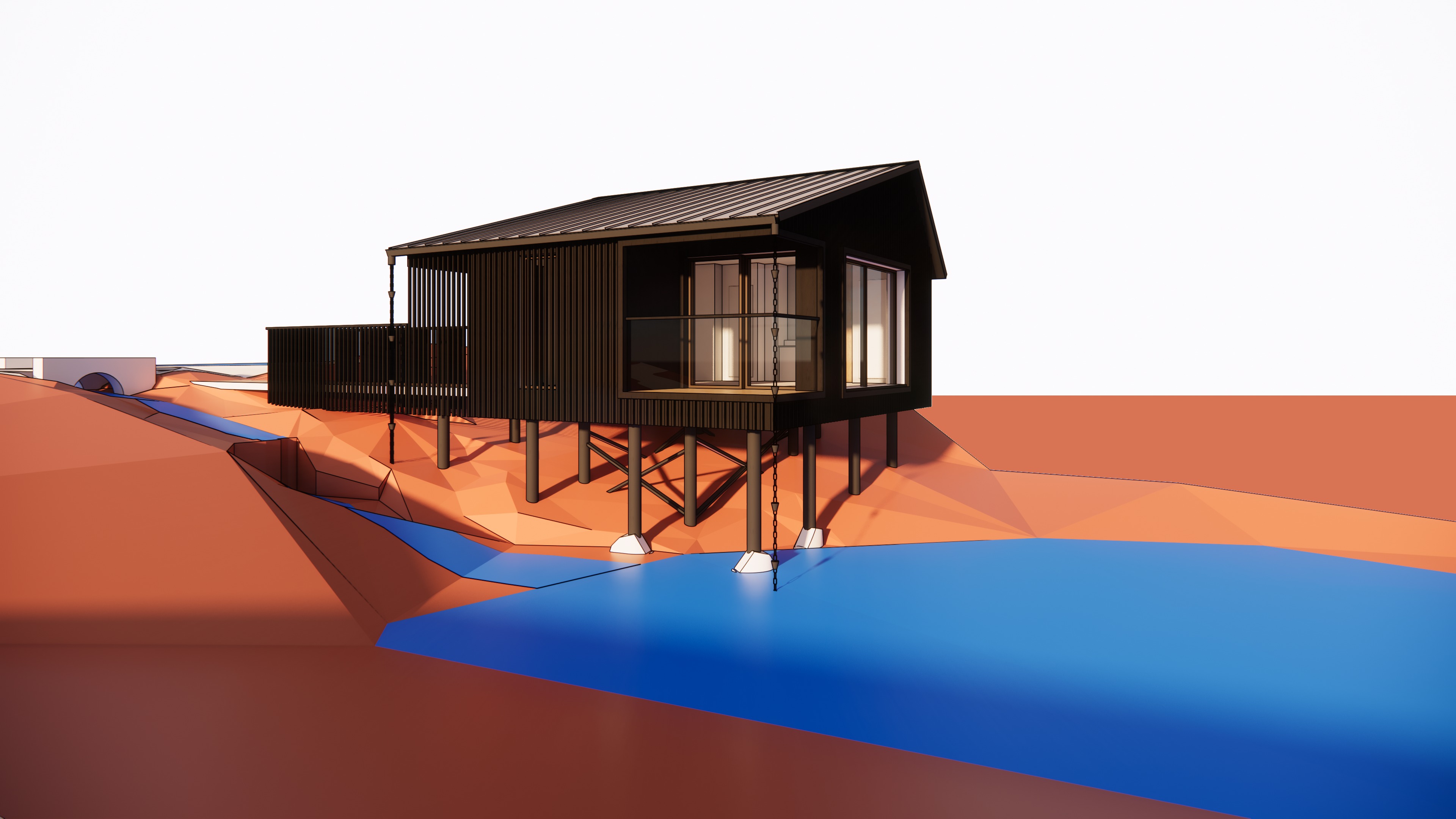 this is a house on top of small pond with small trees in the background the wall material is black burned wood please make it realistic and leave the landscape as it is the ground is dark brown with lush deciduous plants add darmera peltate plants under the house and around water leave the original structure i drawed the extent of the pond area in blue openings are in dark black