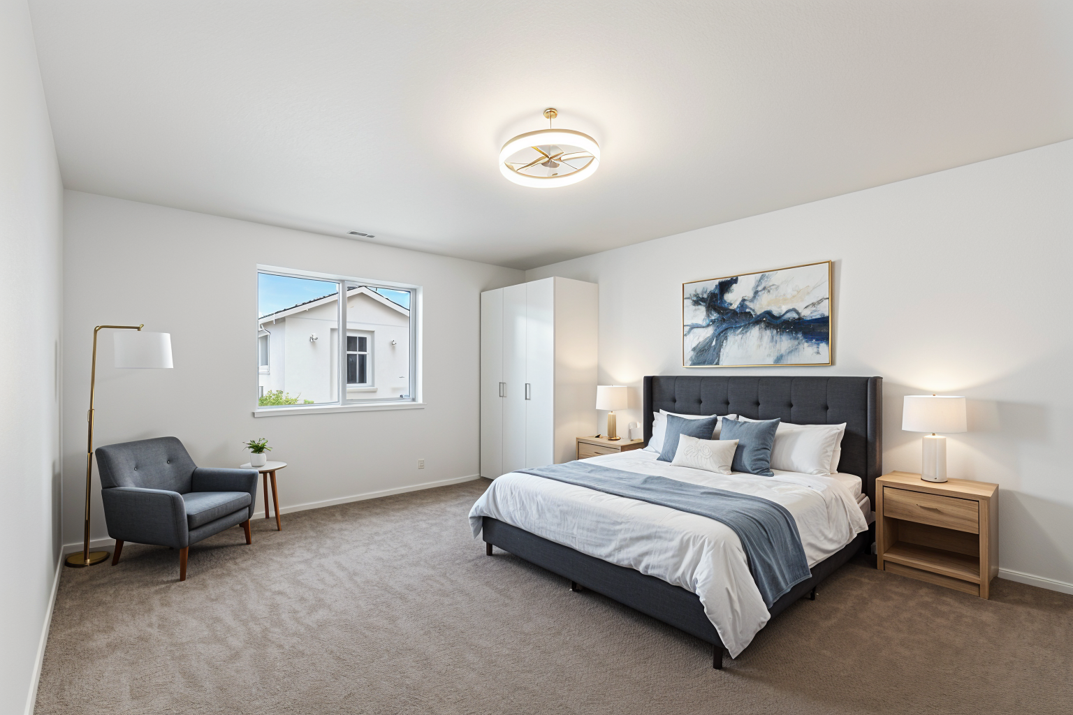 modern exterior shot maple and oak trees minimal grass black shingle roof white board and batten siding sloped loot architecture
