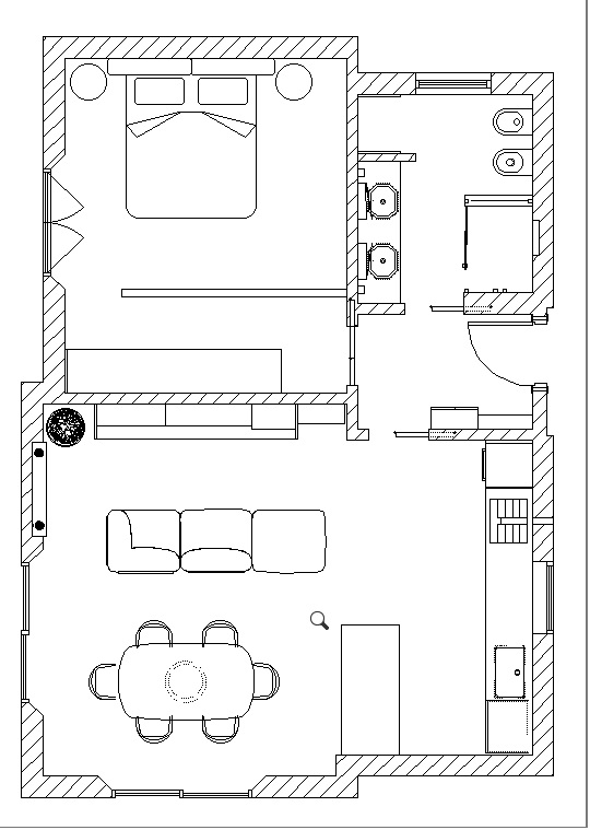 convert this floor plan into a realistic isometric 3d view of a full house show the space from an elevated angle with furniture walls and details visible stile mediterraneo use the same furniture as shows on the plan do not change the orientation of the floorplan