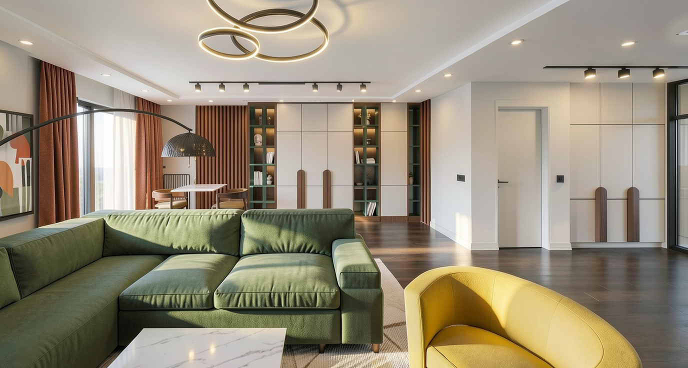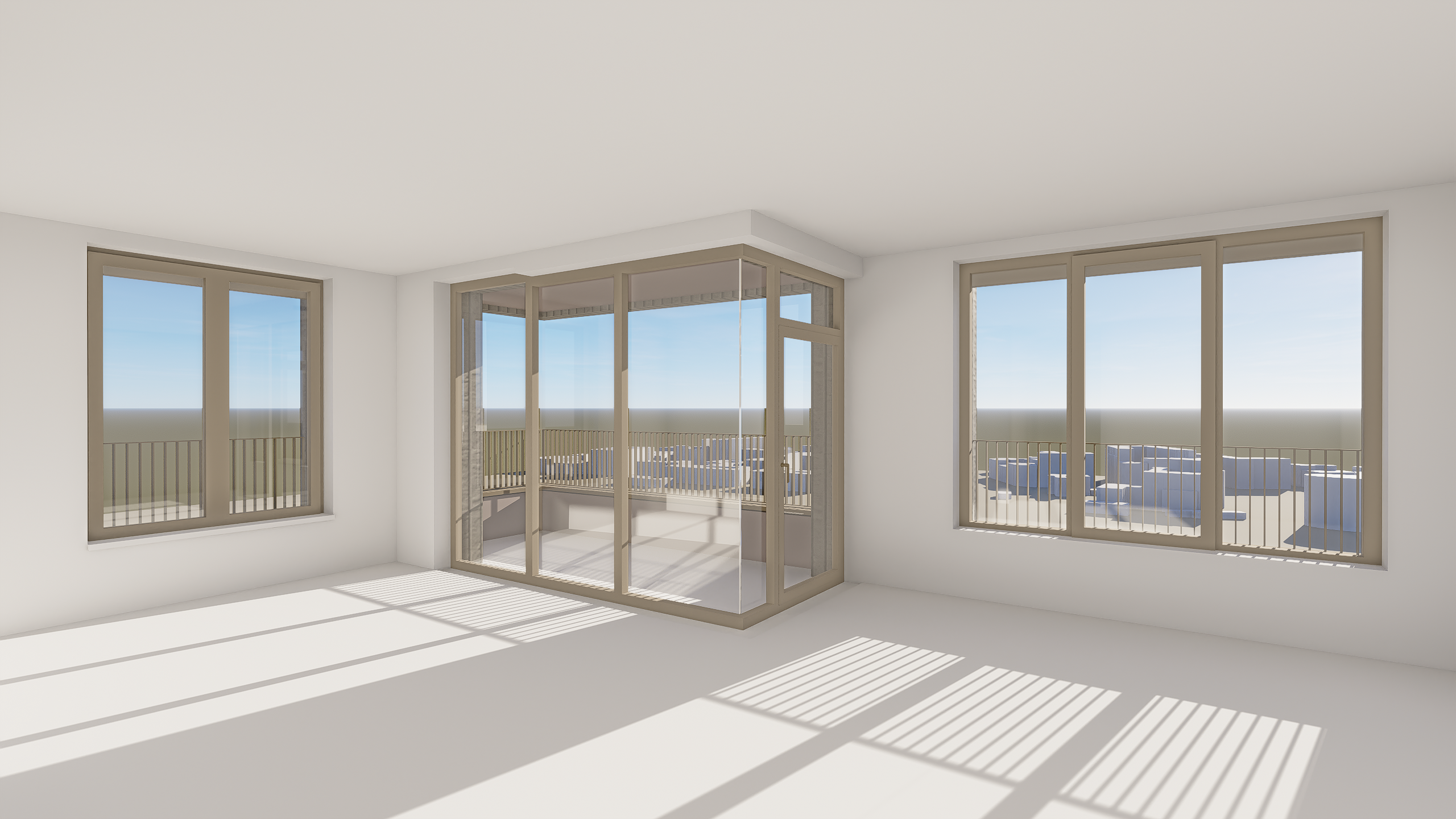 create a realistic architectural interior visualization while strictly preserving the exact camera position perspective room geometry window sizes and composition do not modify the architecture openings or layout set a warm summer sunset outside with golden sunlight entering the room through the windows and casting soft long shadows inside keep the exterior buildings and trees unchanged but adjust the lighting to a late summer evening atmosphere furnish the interior with a modern minimalist industrial style simple neutral sofa low coffee table subtle rug metal floor lamp minimal shelving and a few natural materials like wood and metal maintain a calm clean aesthetic with soft realistic materials warm light reflections and natural shadows so the space looks like a real photograph