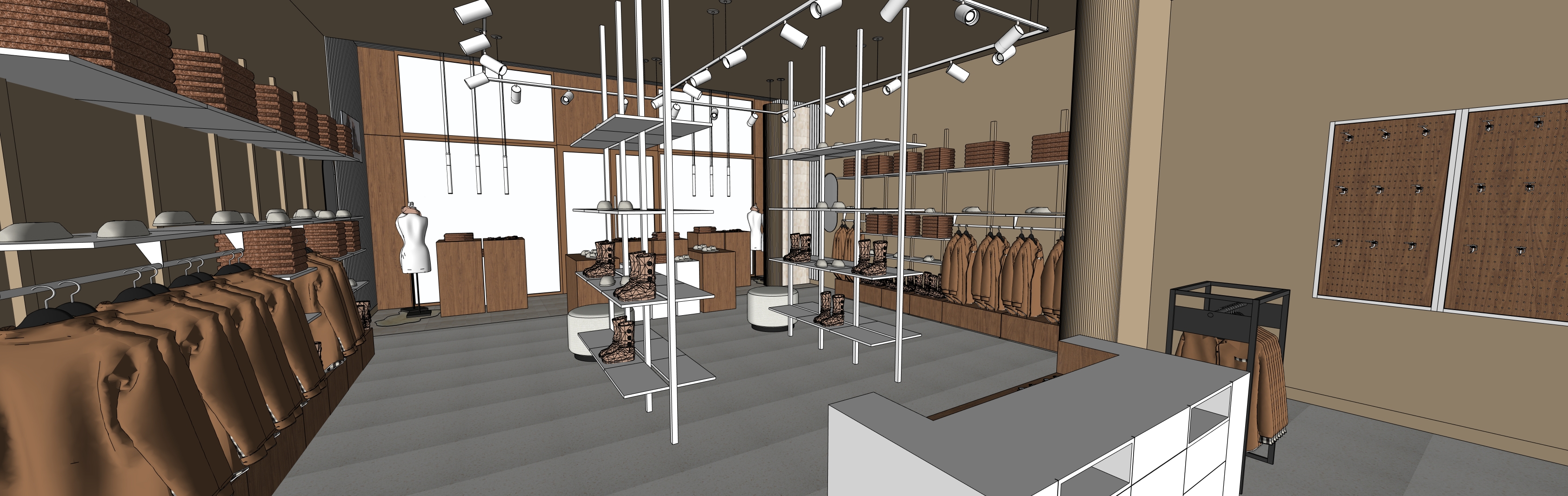 render with warm bright lighting ensure timbers have a soft texture and remain walnut colour and grain ensure lighting to the shop interior lights remove light coming from shopfront glazing