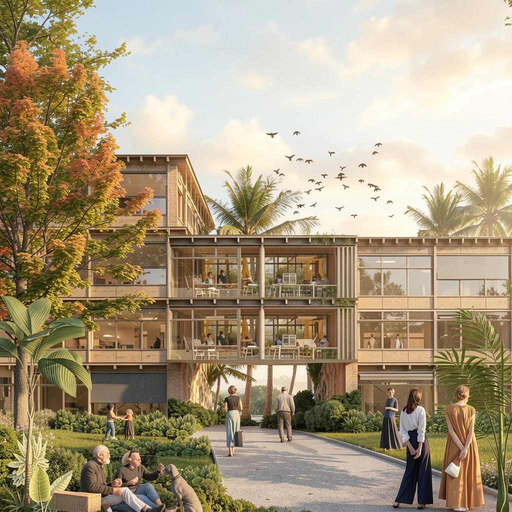 architectural visualization in a soft atmospheric semi sketch rendering style blending hand drawn illustration with photorealistic lighting the image should feel like a high end competition board render or editorial architectural collage preserve 100 of the original geometry composition proportions and material assignments from the input model sketch do not alter the design only enhance its visual expression apply a warm pastel toned color palette with subtle pink peach sky gradients and gentle ambient light lighting should be diffused and natural resembling golden hour with soft haze producing mild shadows and a calm inviting atmosphere materials should appear realistic but slightly stylized with light wood tones transparent glass with gentle reflections not overly sharp muted greens for vegetation soft desaturated finishes avoid high contrast or overly glossy surfaces edges should be slightly softened with a faint hand drawn or watercolor like outline quality giving a sketchy but refined look avoid harsh perfectly crisp cgi edges include collage style entourage elements minimalistic human figures with slightly illustrative style semi flat soft shadows not hyper realistic lush but stylized vegetation layered slightly painterly trees and shrubs birds in the sky as small simple silhouettes subtle life elements people interacting sitting walking with calm natural poses use layered depth and atmospheric perspective background slightly faded and hazy midground crisp but soft foreground slightly more detailed with richer textures incorporate architectural storytelling warm interior glow visible through windows light activity inside spaces a balance between realism and illustration evoking emotion rather than strict photorealism add a slight grain texture and very subtle paper like quality to mimic an architectural presentation board overall mood serene contemporary human centered biophilic design blending architecture with landscape in a harmonious way important do not change the layout massing or materials of the original design do not exaggerate forms or introduce new architectural elements focus only on translating the rendering style lighting and atmosphere