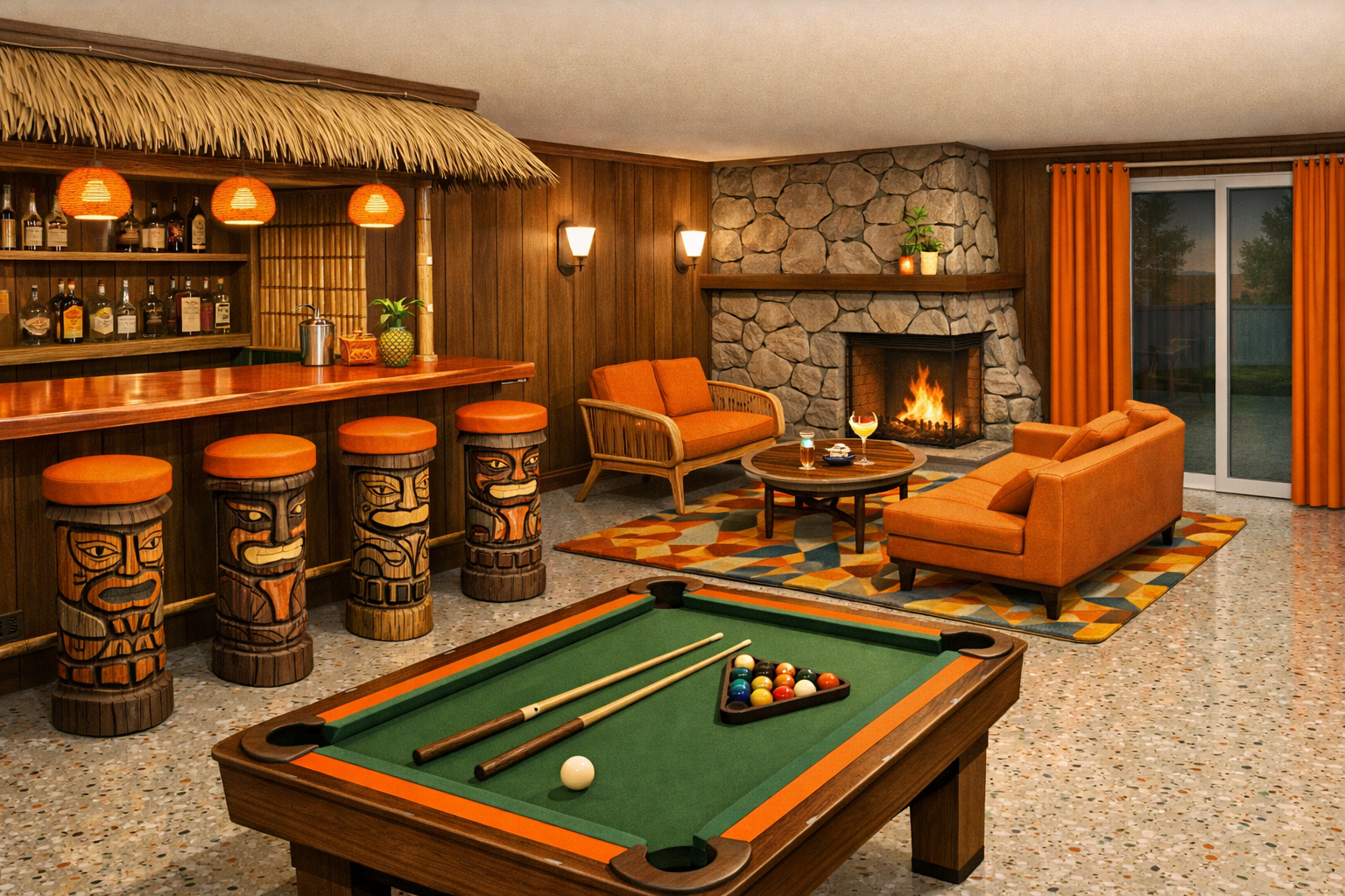 make this look more realistic remove fireplace remove sitting area remove sliding door add antique mirror on back wall of bar add rug under pool table move pool table by right wall add tiki light over pool table remove