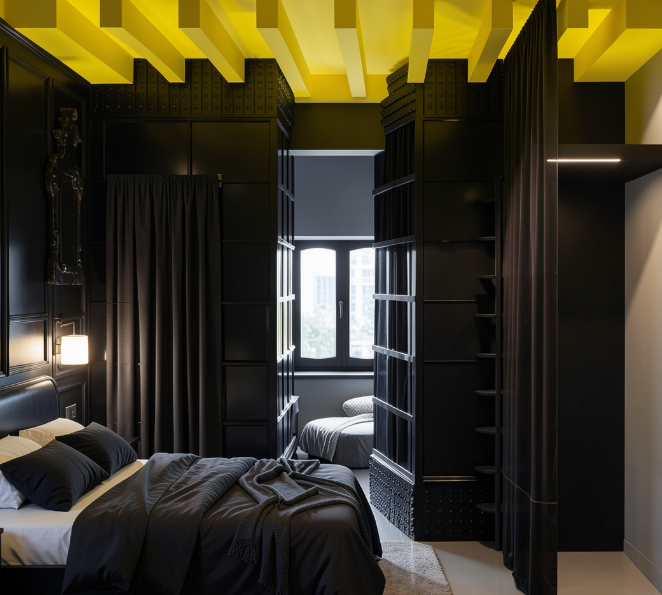 soffitto in legno scuro noce pavimento parquet legno noce togli la tenda a destra e metti sportelli lisci sempre i muri attualemnte neri alli di radica di noce scuro metti una luce serale