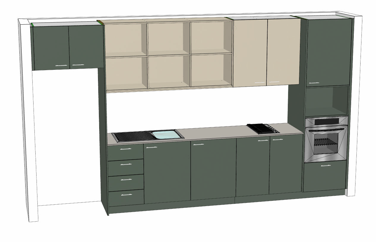 use this view to create a realistic 3d view of the kitchen which opens to the bright stylish living room gentle sunlight enters the room creating light shadows and a pleasant atmosphere add glasses plates etc to the countertop keep the colours of the kitchen materials as in the provided view take a view from the perspective of a standing person from the left to right the tops of the cabinets should touch the ceiling add a double door fridge in the alcove on the left