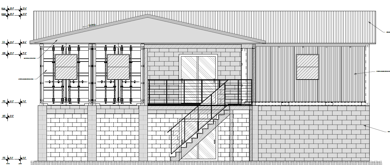 shipping container and masonry home with a metal roof