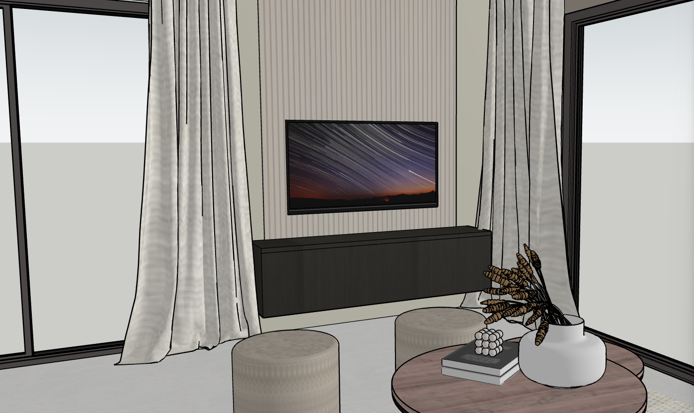 evening light on with led strip light running behind the panel behind the tv and patio paving outside
