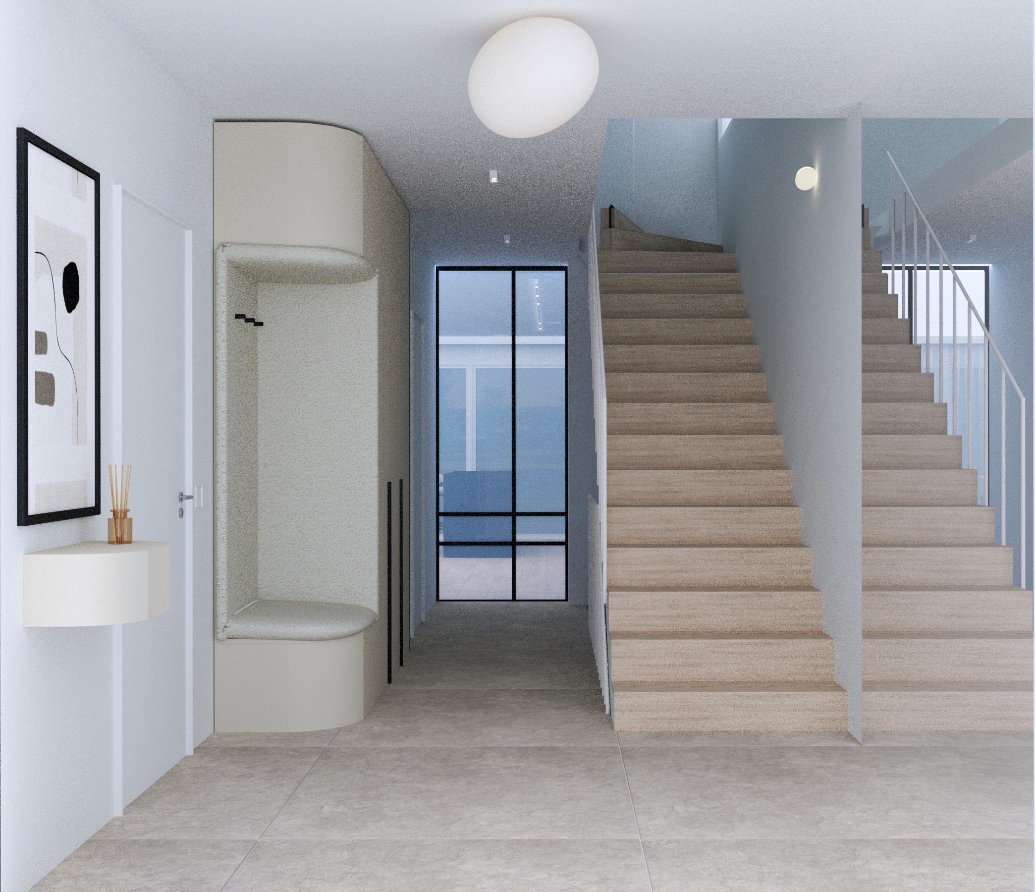 create a modern minimalist hallway with a serene and inviting atmosphere use soft white walls throughout adding a smooth calming ambiance the doorframe and trim should be a crisp white providing a clean contrast the ceiling light fixture should emit a soft warm glow incorporate a stylish abstract framed artwork with neutral tones black beige and light brown the built in seat and storage are in a soft taupe adding functionality and elegance design the staircase with light oak wood steps emphasizing a natural and warm texture large floor tiles have a subtle beige hue enhancing the sophisticated look for the metal frame glass doors at the end use matte black accents adding a modern touch while leading the eye to the next space the overall atmosphere is airy clean and sophisticated