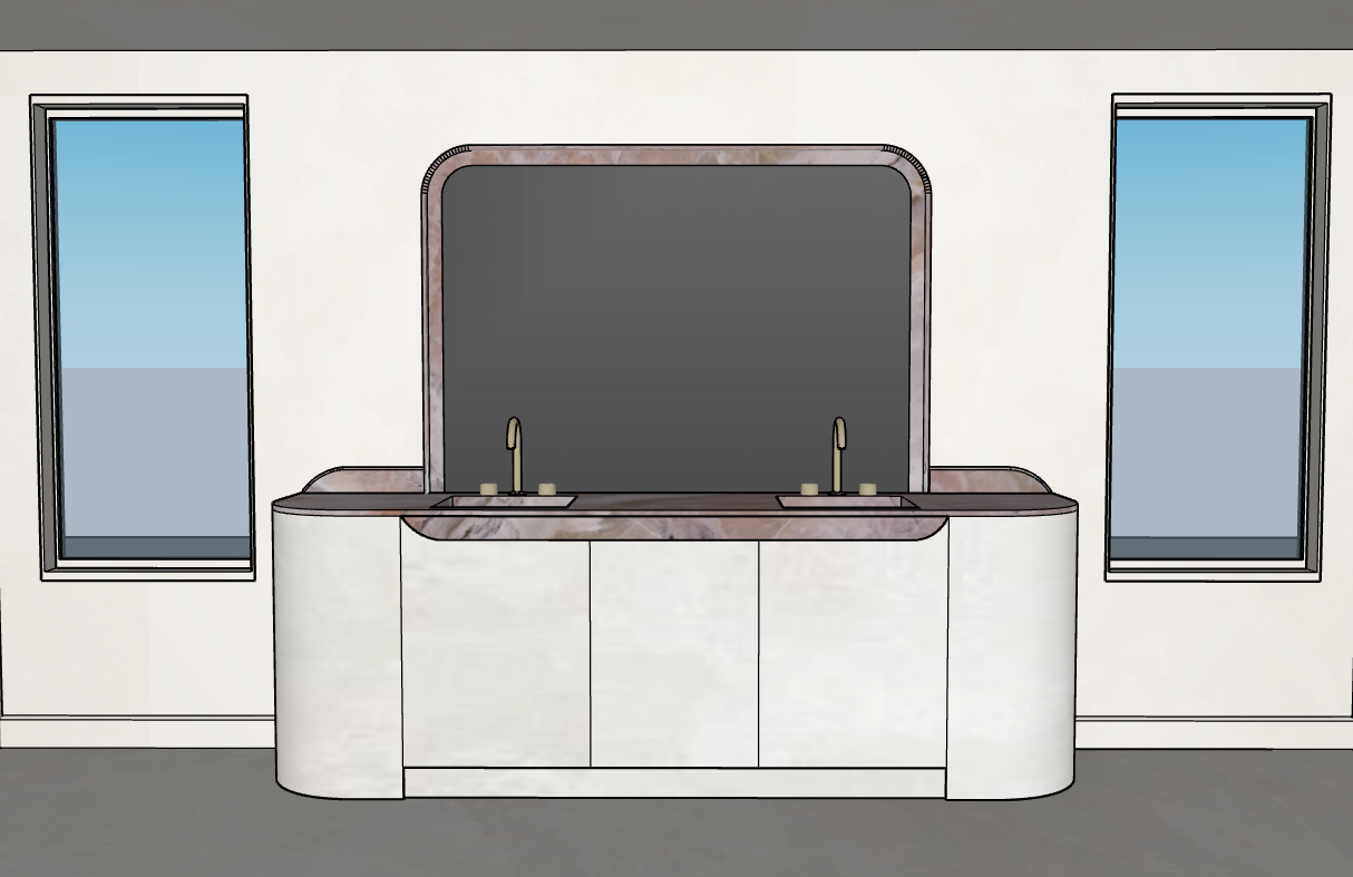 render the space in hyper realistic visualization quality at 8k resolution keep the shape of the vanity exactly as shown the cabinet should be a light colored concrete texture the floors walls and ceiling should all use the same continuous light limewash texture as in the reference image clearly showing a soft limewash painted finish rather than a flat color the mirror should have a gentle natural reflection so it reads clearly as a real mirror include three small recessed ceiling lights positioned above the vanity through the windows trees should be visible outside to create a natural exterior view the overall image should feel realistic calm and natural with accurate lighting and material texture