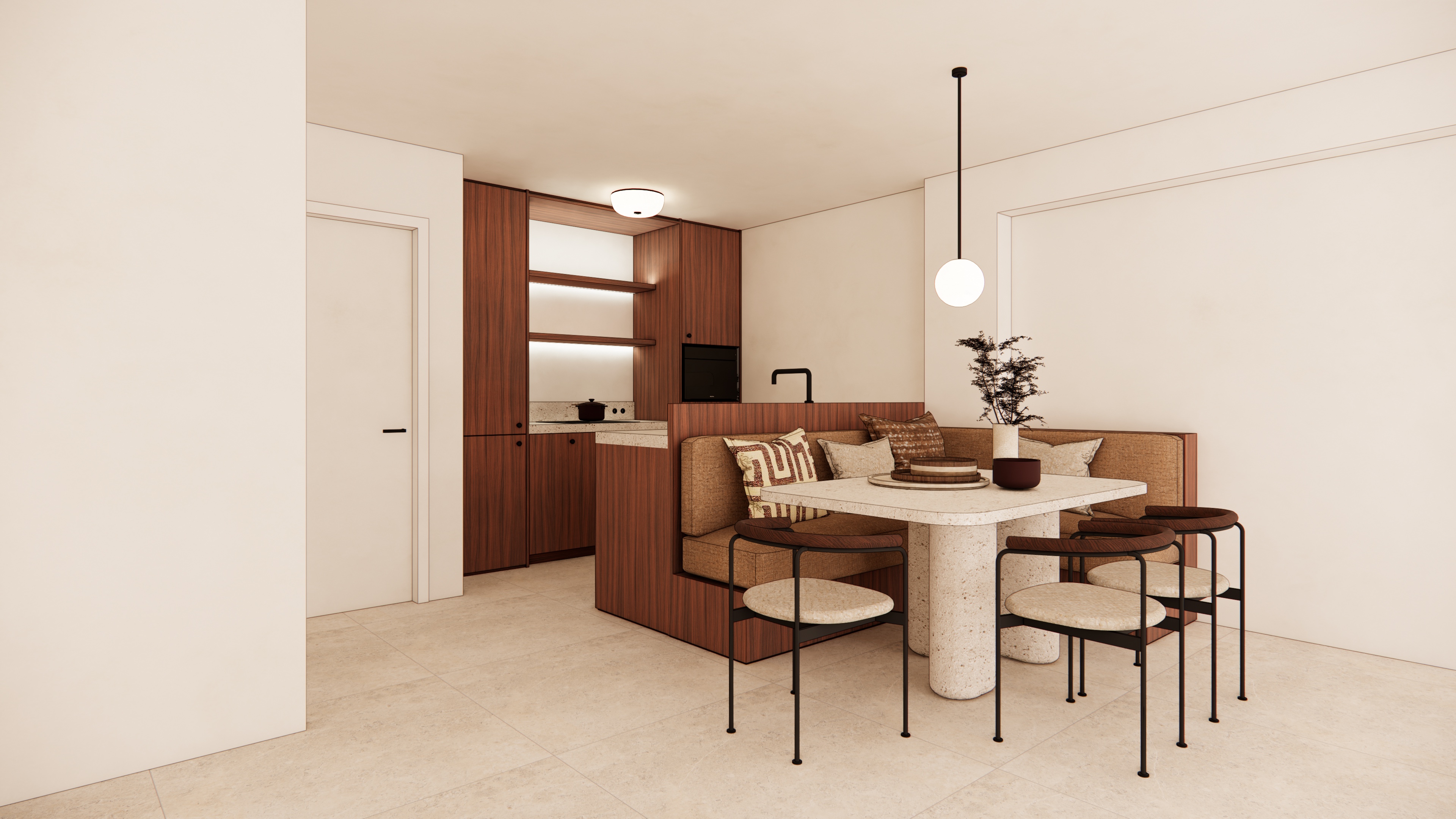 high end architectural interior realistic render calm and refined atmosphere soft natural daylight neutral warm palette balanced tones no orange cast diffused light with soft shadows subtle contrast natural color accuracy emphasis on materiality and texture tactile surfaces minimal styling clean architectural lines integrated design serene and timeless space depth and layering cinematic softness slightly desaturated tones photorealistic 35mm lens soft color grading quiet luxury emotional balance breathing space no harsh lighting no strong color cast no oversaturation maintaining 100 of the geometry materials colours and layout with a sharp photorealistic result add more natural daylight maintaining 100 of the geometry and layout with a sharp photorealistic result
