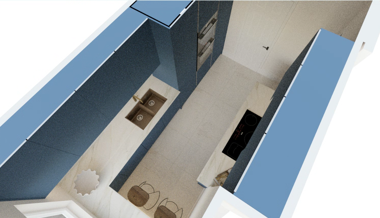 make the blue a little bit darker give better lighting change the stools to something modern facing the window dont change the design