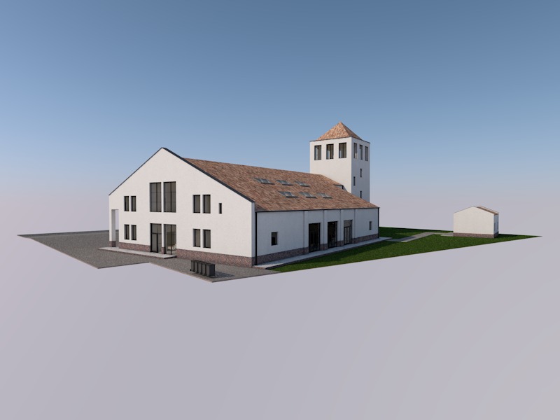 wide angle exterior architectural visualization of project description midday neutral cool natural daylight no artificial lighting visible balanced exposure medium low saturation controlled contrast corporate architectural photography style no cinematic effects no dramatic sky no warm tones clear pale blue sky with minimal soft clouds vegetation in muted olive green tones low vibrancy landscaping engineered and maintained environment clean materials without wear clear material differentiation architectural mass reads before texture subtle structural emphasis systemic spatial clarity investor oriented tone subtle emotional trigger of stability and competence ultra realistic high resolution professional architectural documentation style no sunset lighting no golden hour no warm color cast no cinematic atmosphere no dramatic fog no lens flare no oversaturated colors no lifestyle staging no artistic grain no excessive depth of field blur
