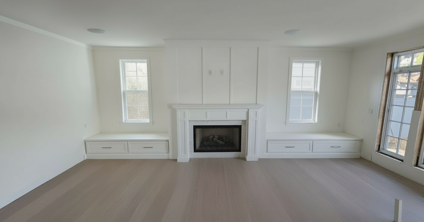 add some arched alcove framing over both windows like the reference photo but put some built in shelves built into the framing