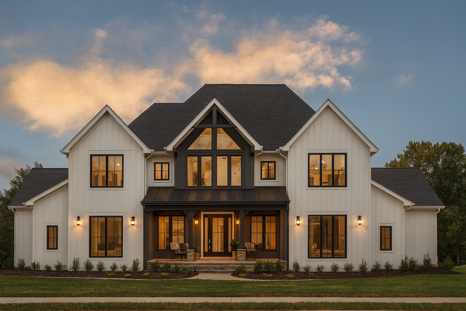the style is modern transitional the tine 10x12 triangles on the room represent the pitch and are not windows create the image so that the slab is brick and the siding is white board and batten the roof over the front porch is black metal the middle dormer and front porch should be dark add wooden columns to the front porch
