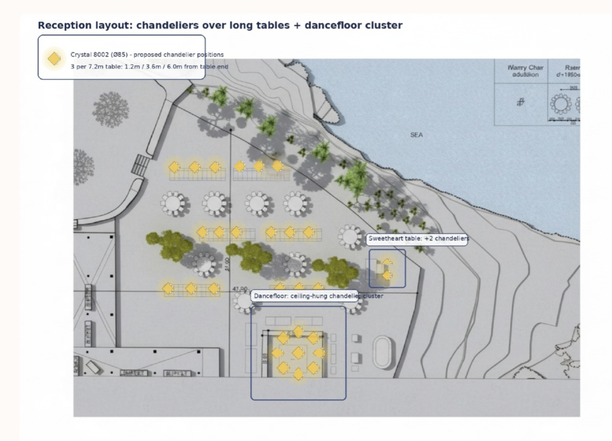 exterior shot use the uploaded reception layout as the ground truth for positioning transform this floor plan into a photorealistic 3d wedding reception render keep the exact chandelier locations shown in the dancefloor cluster total fixtures 9 symmetrical grid exactly as drawn replace every chandelier with the product from the reference photo do not redesign the fixture dancefloor size 8m x 8m create an elegant seaside luxury wedding under an ivory draped tent gold mirrored bar at the back neutral lounge seating left and right white and soft blush florals camera at guest eye level wide shot so the entire chandelier cluster is visible realistic scale realistic hanging height around 3m from floor photorealistic lighting warm glow