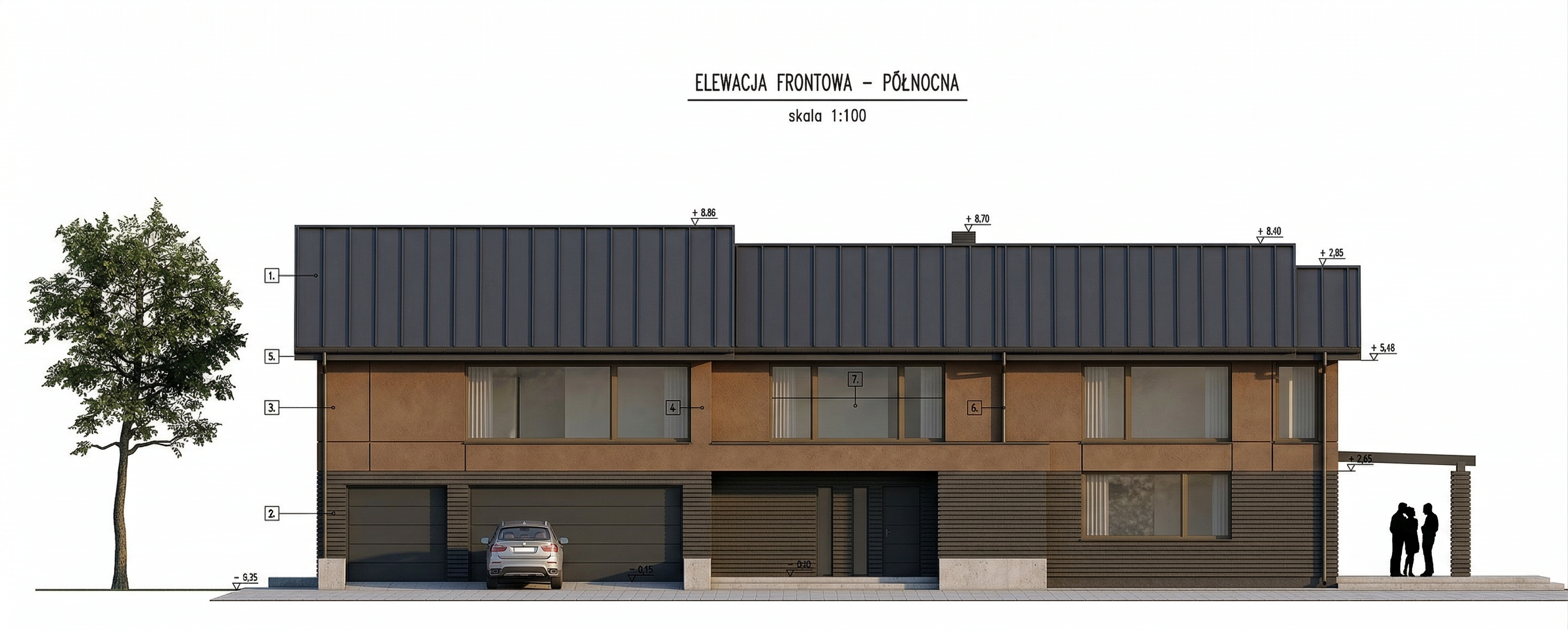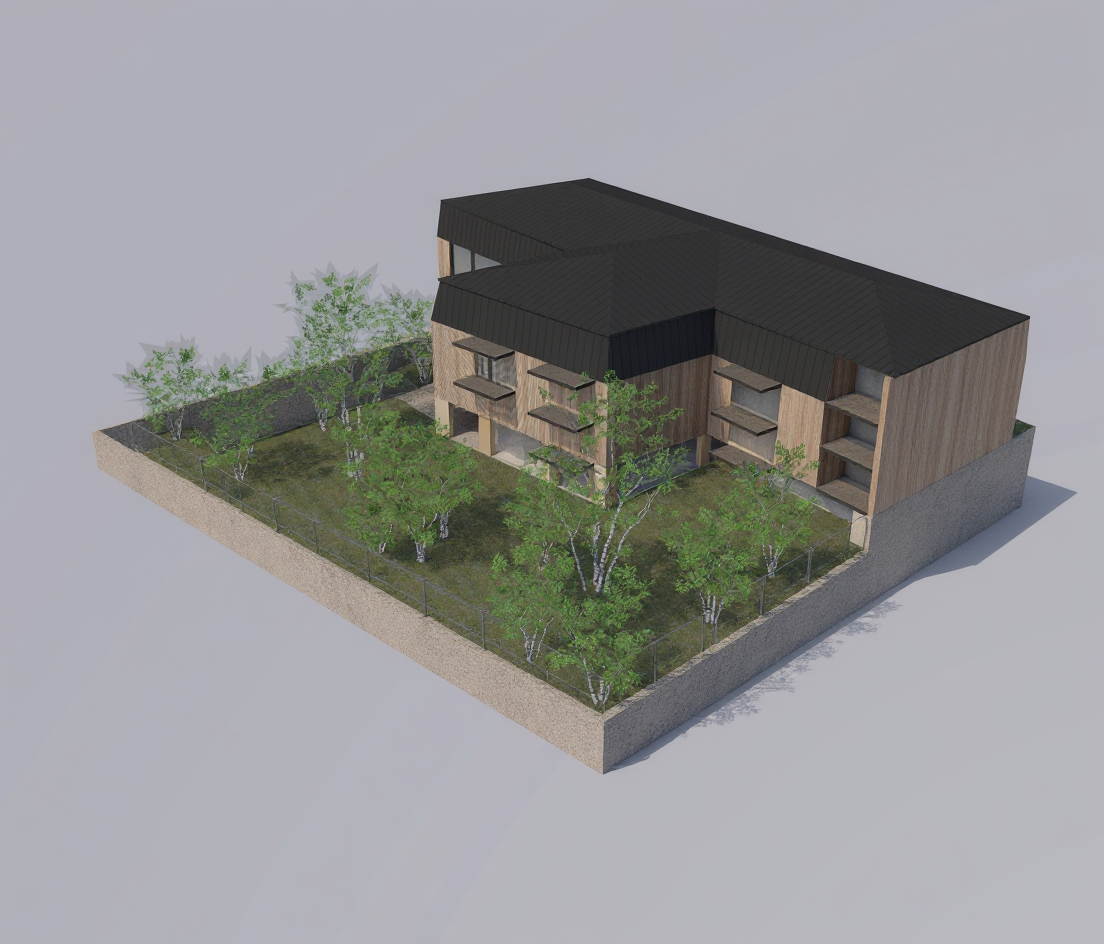 architectural rendering of a modern multi story building featuring a sleek black roof and beige walls with wooden cladding accents add large windows and white balconies to enhance aesthetic appeal the landscape is dotted with lush green trees and a well maintained lawn set in a serene and cloudy atmosphere giving a soft diffused light that highlights the textures and colors subtly use a complementary color palette with earthy browns for the ground and subtle gray skies conveying a calm and harmonious environment
