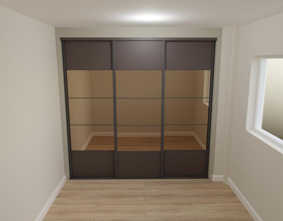 bronzed mirrors reflect a white door in the middle of the wall