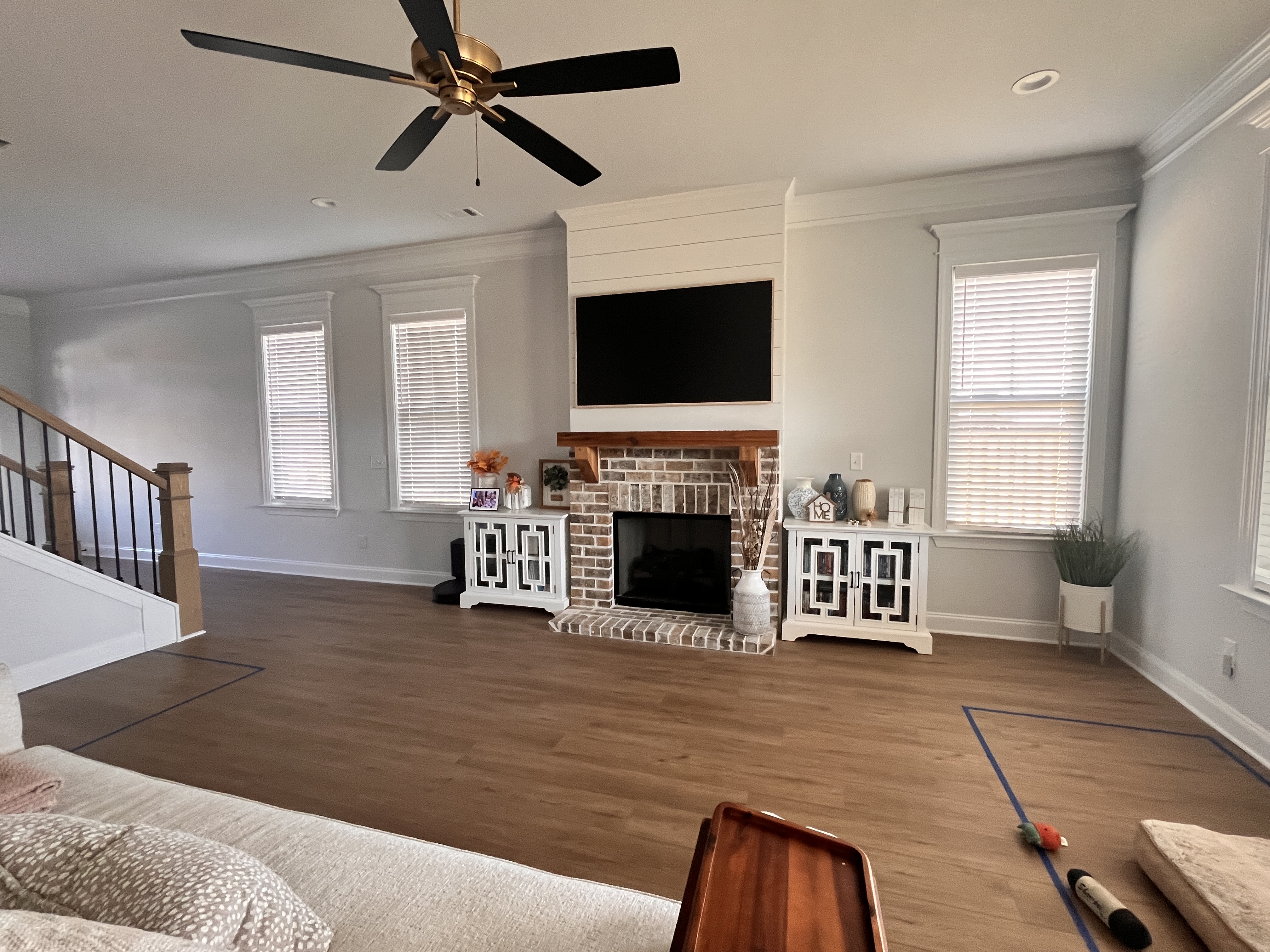 please remove the objects on top of those two white cabinets architecture