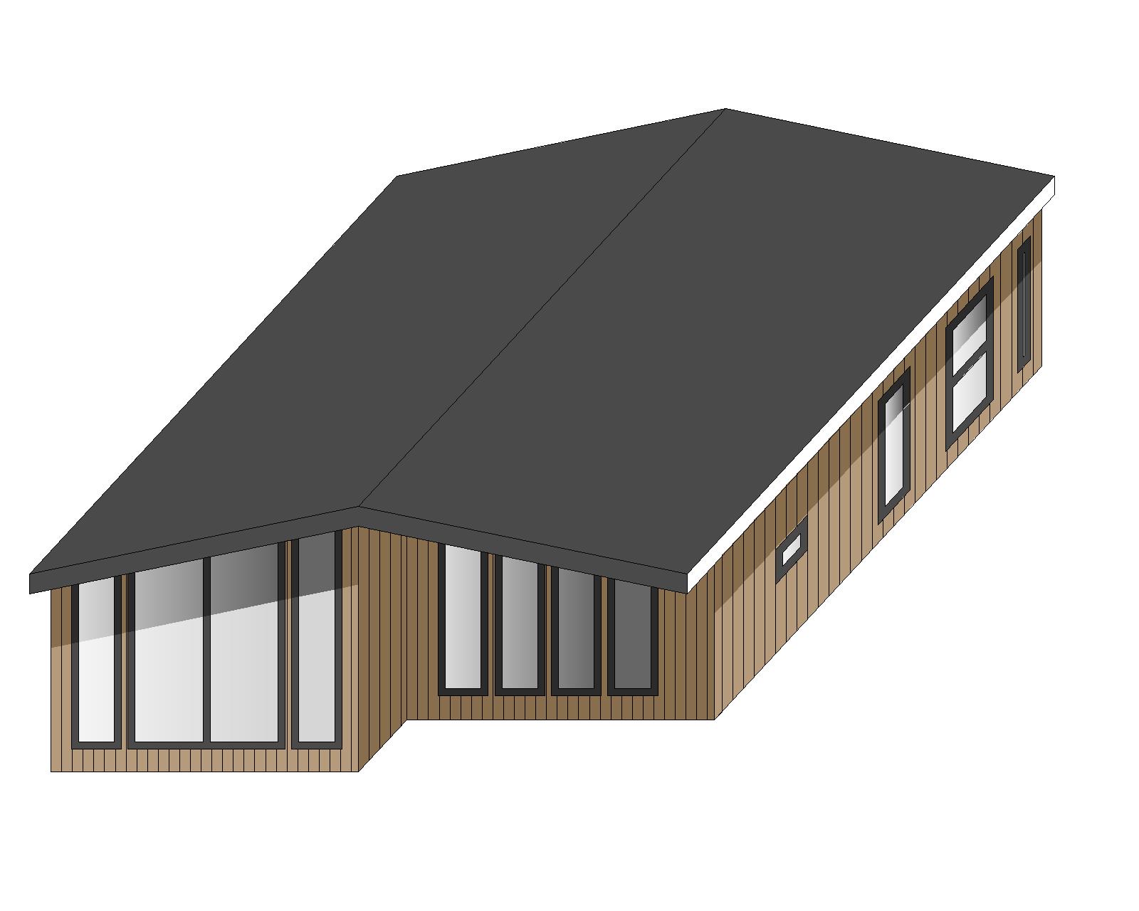 a realistic visualization of a modern modular mobile house inspired by the attached design eye level view slightly from the side a single story house with a simple modern shape and a gable roof facade made of vertical wooden boards in a warm natural color large glazing at the front and narrow side windows dark graphite roof minimalist scandinavian style realistic materials natural daylight soft shadows surroundings grass delicate vegetation neutral background high quality photorealistic architectural render 4k