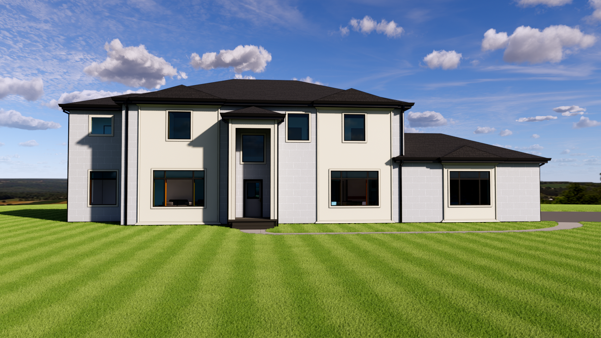 main color is white cmu tile block second color is light beige stucco roof is black shingle window and door frames are black door is light wood color gutters are black fascia is black add landscaping and forest background keep look and direction of sidealk and driveway exactly as is window trim is light biege stucco