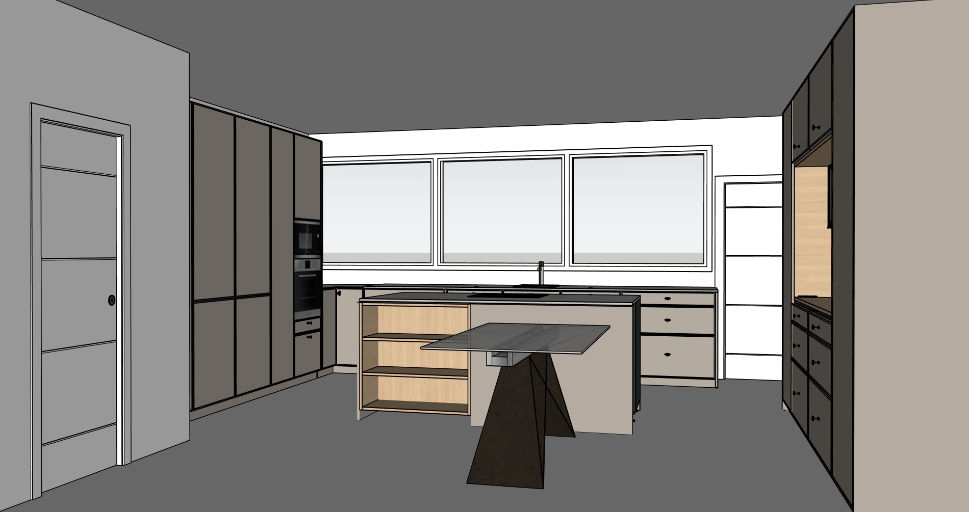 crea una imagen fotorealista a partir de este sketchup realzas texturas e iluminacion es una cocina