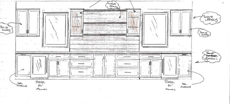 cabinets are fabuwood dove white center is timber shiplap shelves are black lighting in two glass cabients attached to shelves lighting through two windows under cabinet lighting