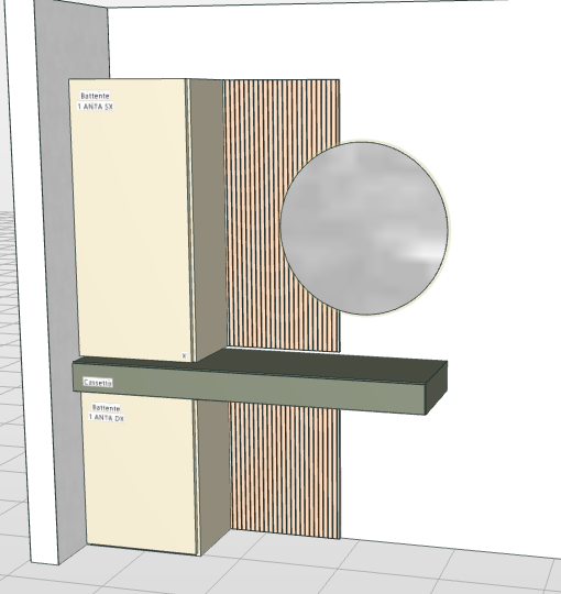 ultra photorealistic interior render based on the provided image preserve exactly the original furniture layout proportions wall positions and camera angle remove all technical symbols labels arrows and texts from the cabinet and wall surfaces do not modify cabinet color material tone shelf color wall finish furniture layout or proportions materials maintain all materials identical to the original reference image the wall boiserie must appear in light natural wood with realistic vertical grooves enhance the wood texture with subtle grain and depth matte cabinet surfaces must appear smooth with soft light diffusion maintain the exact original color palette mirror add a round mirror with integrated backlighting soft led backlight behind the mirror perimeter neutral white glow evenly diffused on the wall no visible light source no harsh halo effect styling add minimal entrance decor on the shelf small tray keys decorative vase keep objects elegant and well spaced lighting soft neutral daylight balanced global illumination subtle shadows around the cabinet and shelf no warm color cast no color shift rendering style high end architectural photography look photorealistic materials sharp details neutral natural color grading no architectural reinterpretation