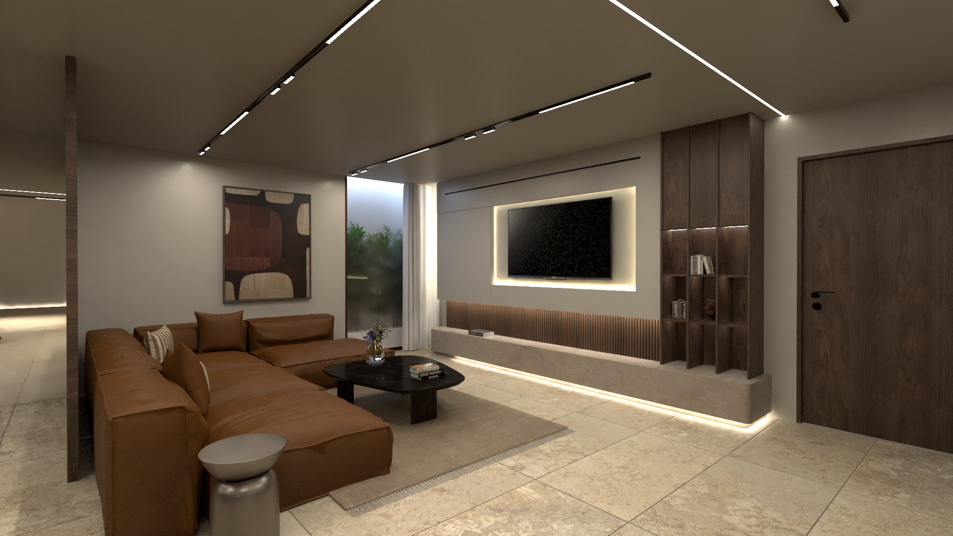 a hyper realist image of a media room interior in a villa basement