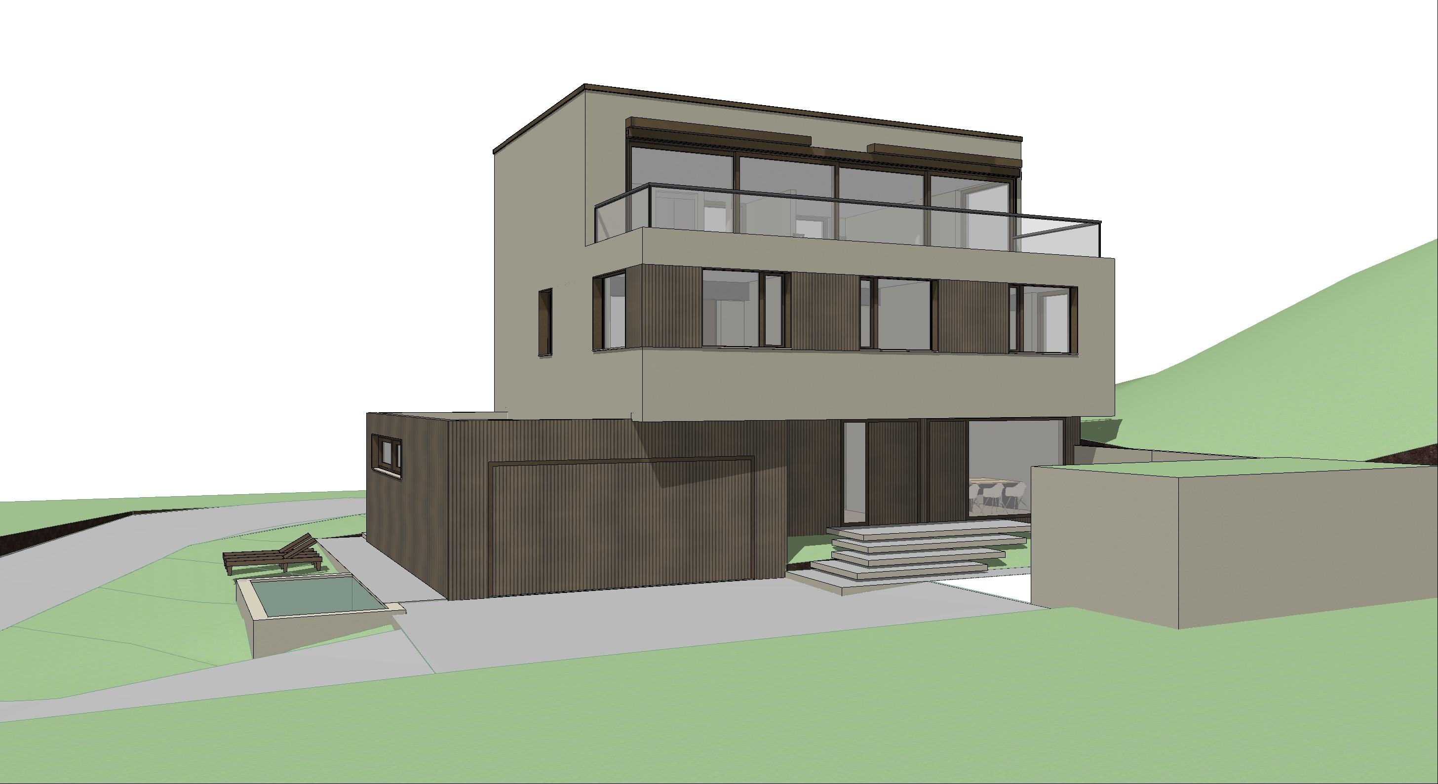 lot of light and reflects in the window smetalic and plaster facade in the hills of switzerland lauriers gras lot of sun some swiss pain trees on the background