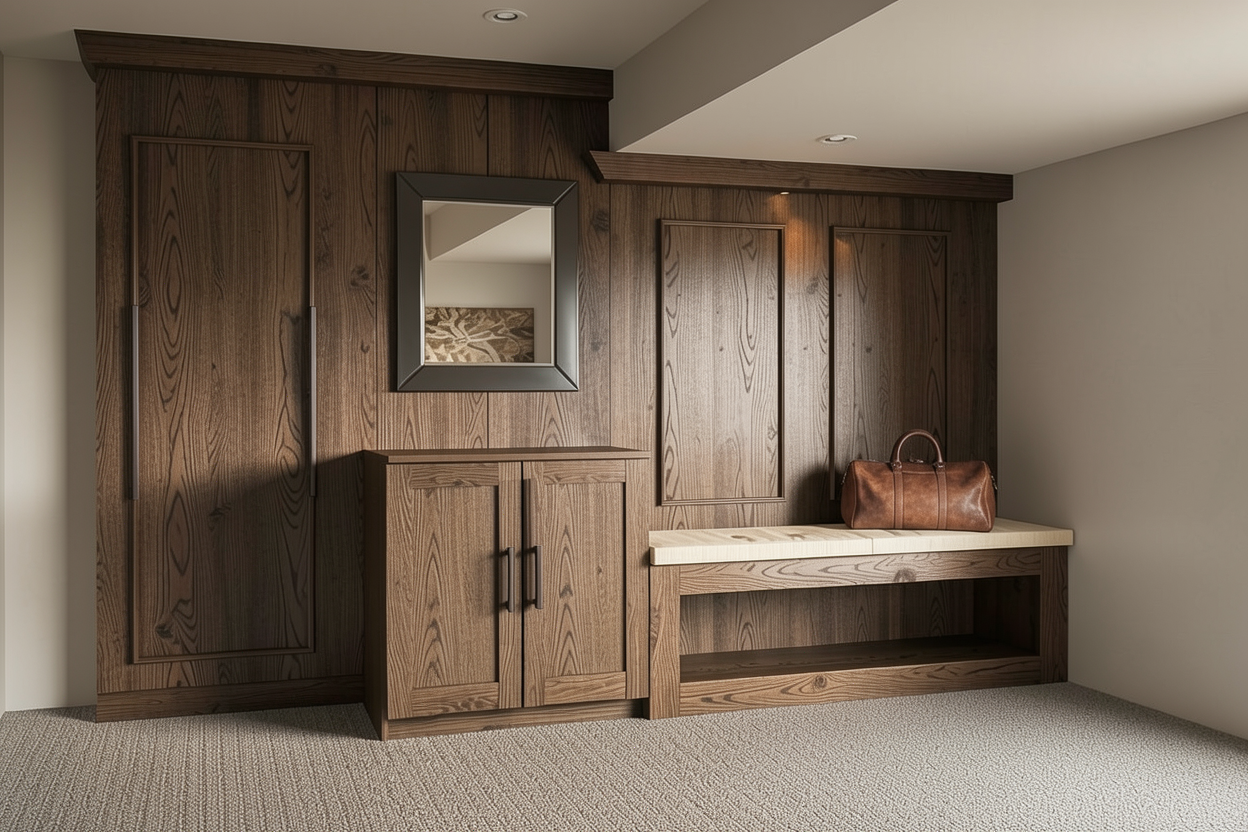 nano prompt refine coda lobby layout mirror cabinetry integrate lounge bar no structural changes use the provided lobby image as the base use the floor plan as the spatial guide hard constraints do not break do not change walls ceiling height windows or room proportions do not move reception desk do not change camera angle or perspective do not enlarge or shrink the space keep all pathways and circulation clear per floor plan only modify millwork furniture and styling 1 mirrored cabinetry left right balance take the existing walnut retail coffee cabinet on the left and mirror it on the opposite side to create symmetry both units are floor to ceiling built ins match material exactly rich walnut warm integrated lighting left cabinet existing refine only keep shelving composition tighten styling fewer objects more spacing merchandise coffee bar integrated right cabinet new mirrored same proportions and vertical rhythm same lighting tone and shelf spacing slight variation in styling not identical objects include coffee service clean minimal house of coda retail folded textiles ceramics books no clutter no convenience store feel 2 lounge area bar integration in the lounge seating zone per floor plan transform the seating area to integrate a concealed interior bar that connects to the exterior bar concept bar design low horizontal bar built into the back edge of the lounge finished in plaster or walnut to match palette clean front face minimal detailing operable element top portion of the bar hinged or sliding panel opens upward or outward creates a pass through service opening when closed reads as clean millwork or wall panel when open functions as a bar facing interior seating 3 lounge seating adjust not crowd keep layout from floor plan but refine two curved sofa groupings facing inward maintain open center circulation keep spacing generous furniture ivory or sand curved sofas add one olive or camel accent piece per grouping round walnut coffee tables centered in each zone no overcrowding 4 center zone keep open do not overfill the middle of the room maintain open circulation spine from entry reception elevator any added pieces must feel secondary not dominant 5 material color reinforcement push richness slightly walnut millwork deeper tone clay olive accents in textiles warm plaster walls not flat beige bronze or dark metal accents avoid overly pale limestone look 6 lighting keep ceiling lighting as is enhance with warm integrated cabinet lighting subtle glow at bar area table lamps in lounge zones maintain 2700k warmth 7 atmosphere feels like boutique hotel design showroom social lounge day calm and refined night warm intimate slightly moody style keywords symmetrical millwork integrated hospitality design concealed bar venice modern warmth layered neutrals refined lounge flow architectural restraint