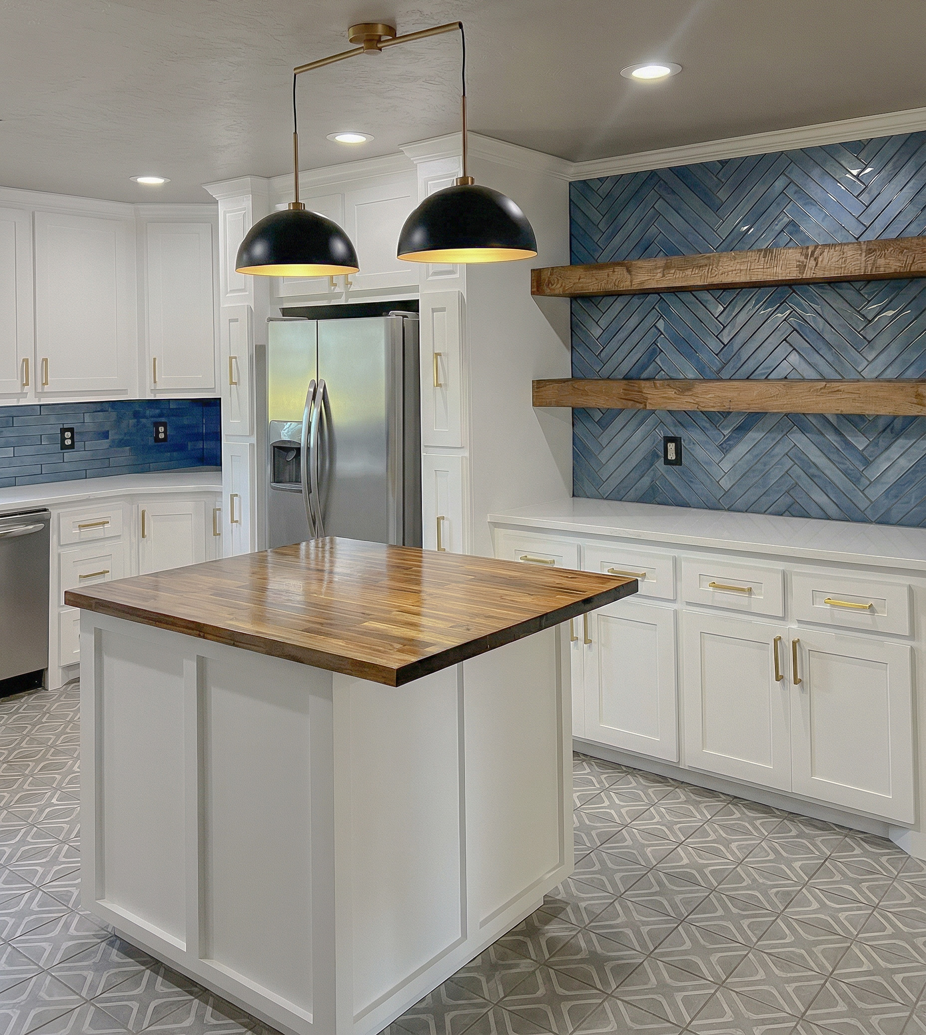 add dark blue floral velvet barstools at the end of the bar