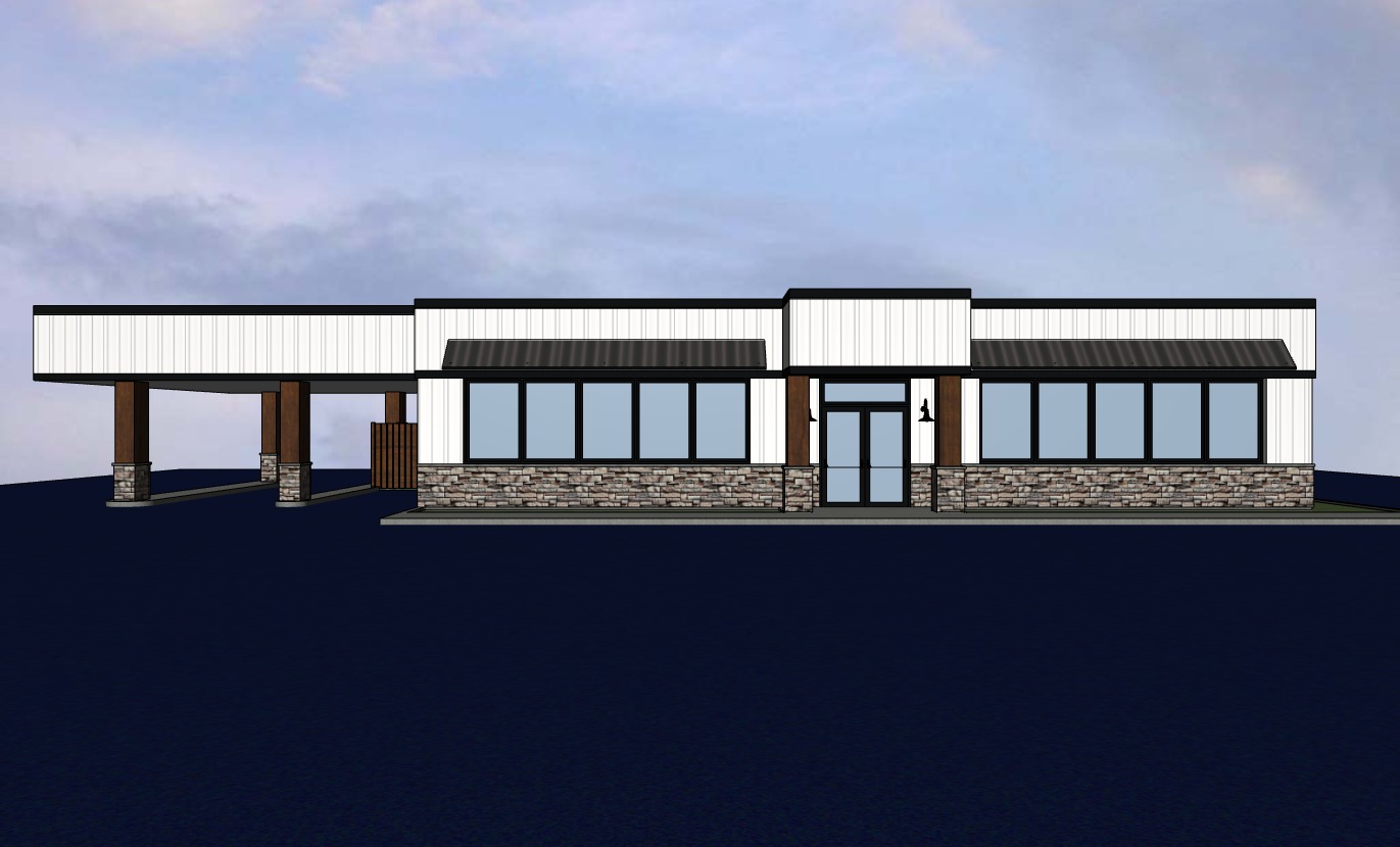 commercial building black window frames white board and batten siding black metal awning roofs cedar posts minimal landscaping