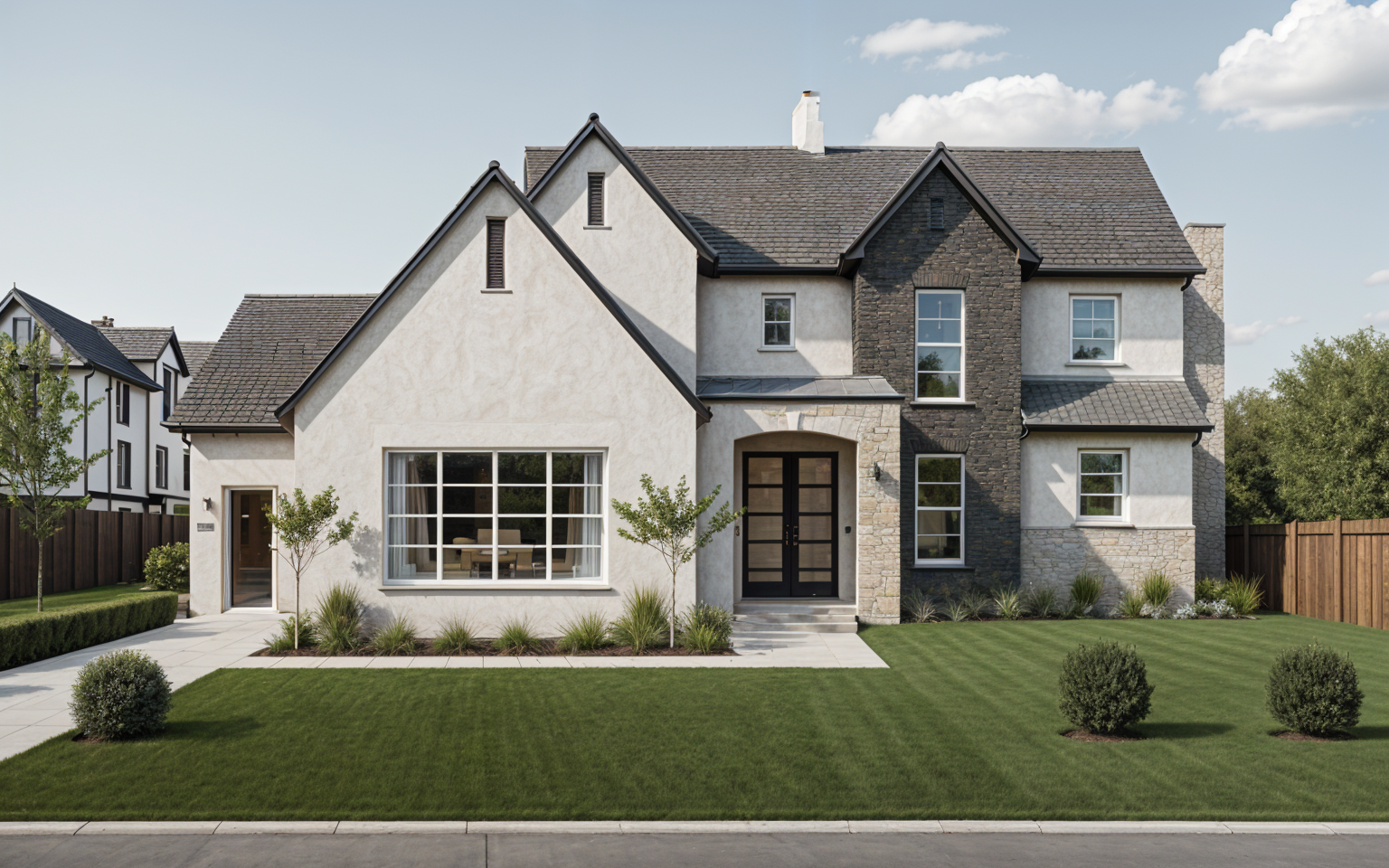 modern two story house with a combination of white stucco and light gray stone exterior featuring a gabled roof with dark gray shingles large white framed windows and a wood front door lush green manicured lawn with well maintained bushes and small trees on either side of the walkway a wooden fence in the background along with neighboring houses in similar style soft natural sunlight and a clear blue sky with a few fluffy clouds for a serene and inviting atmosphere