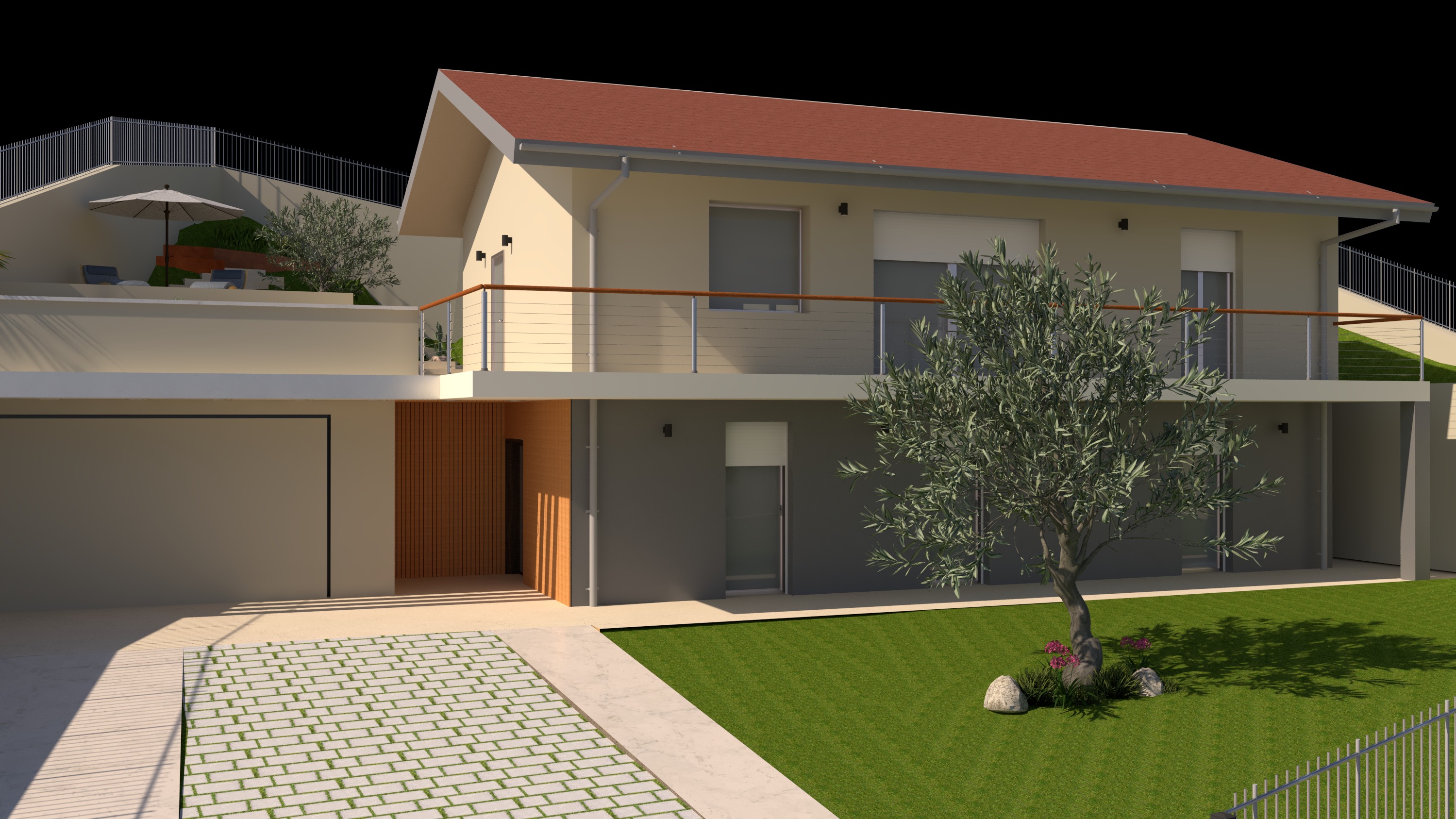 rendila reale mantieni gli stessi colori grigio al piano terra anche il garage e marroncino al primo piano