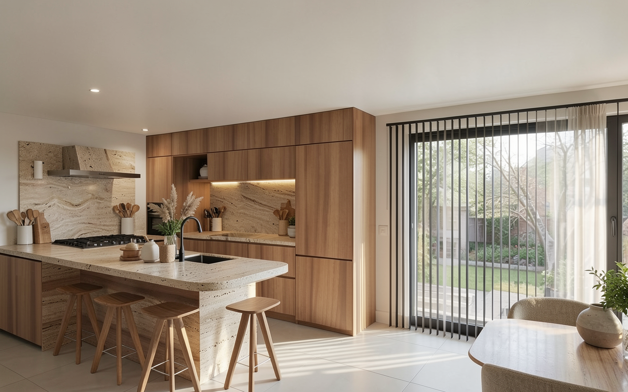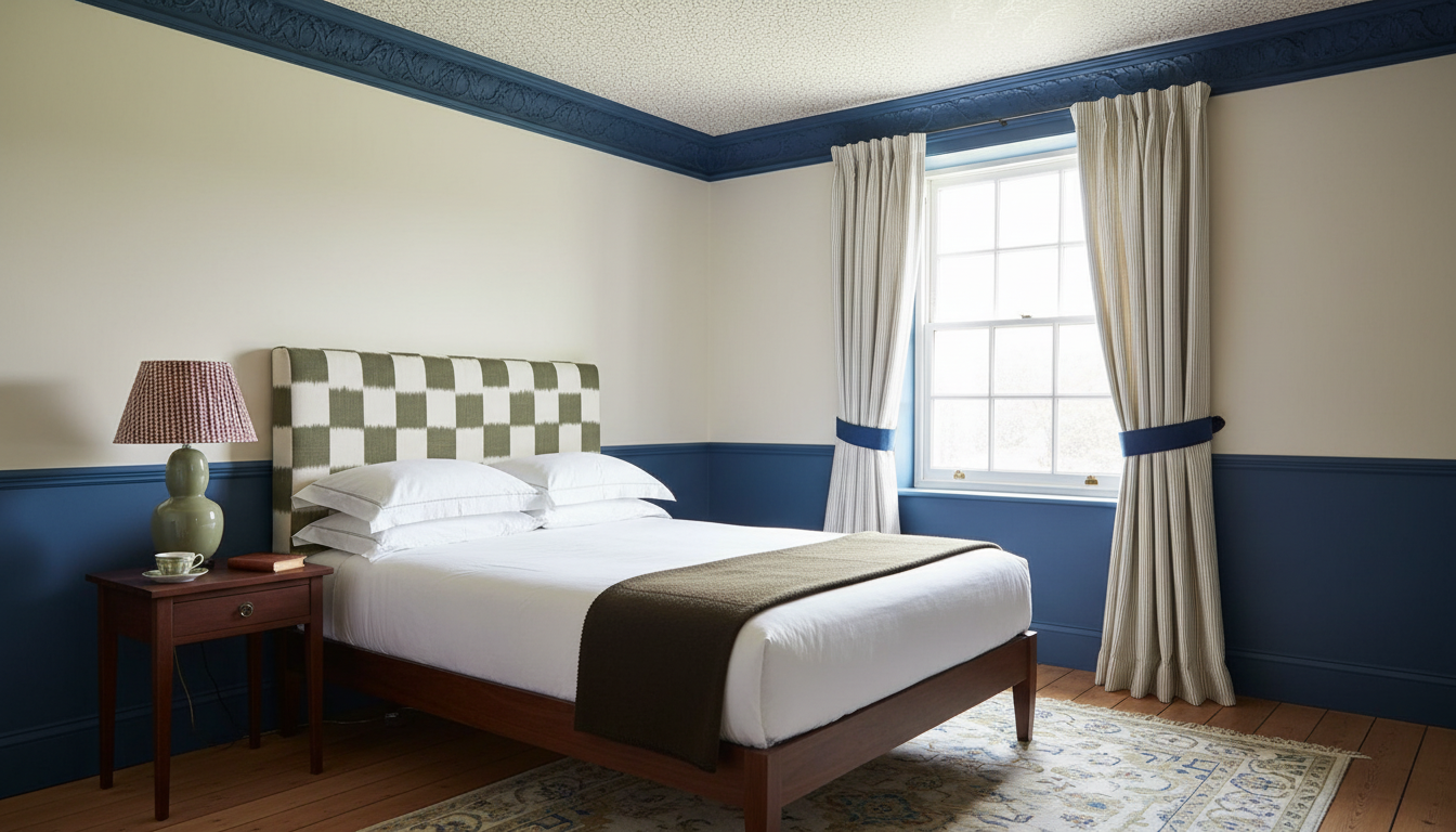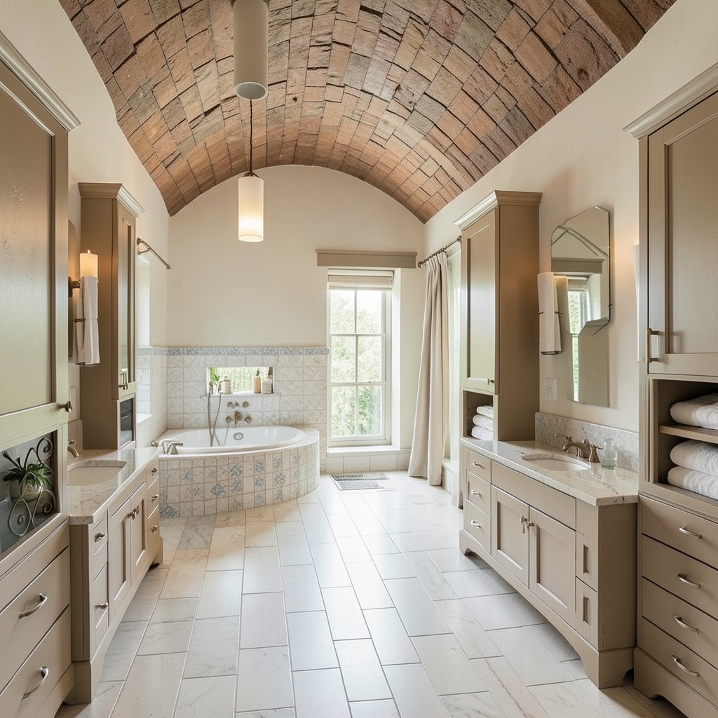 maintain all geometry create a hyper realistic interior rendering this is a second floor room so the view out of the window should reflect that and show trees in the distance the painted casework should be a semi gloss finish the wood casework should remain as wood with a gloss finish the sconces should be lit in a 2700k temperature and a soft glow the ceiling should be a matt paint finish the item above the toilet is a sconce that should show as lit in the center but diffused from view and there is a circular marble plate on the back that should glow