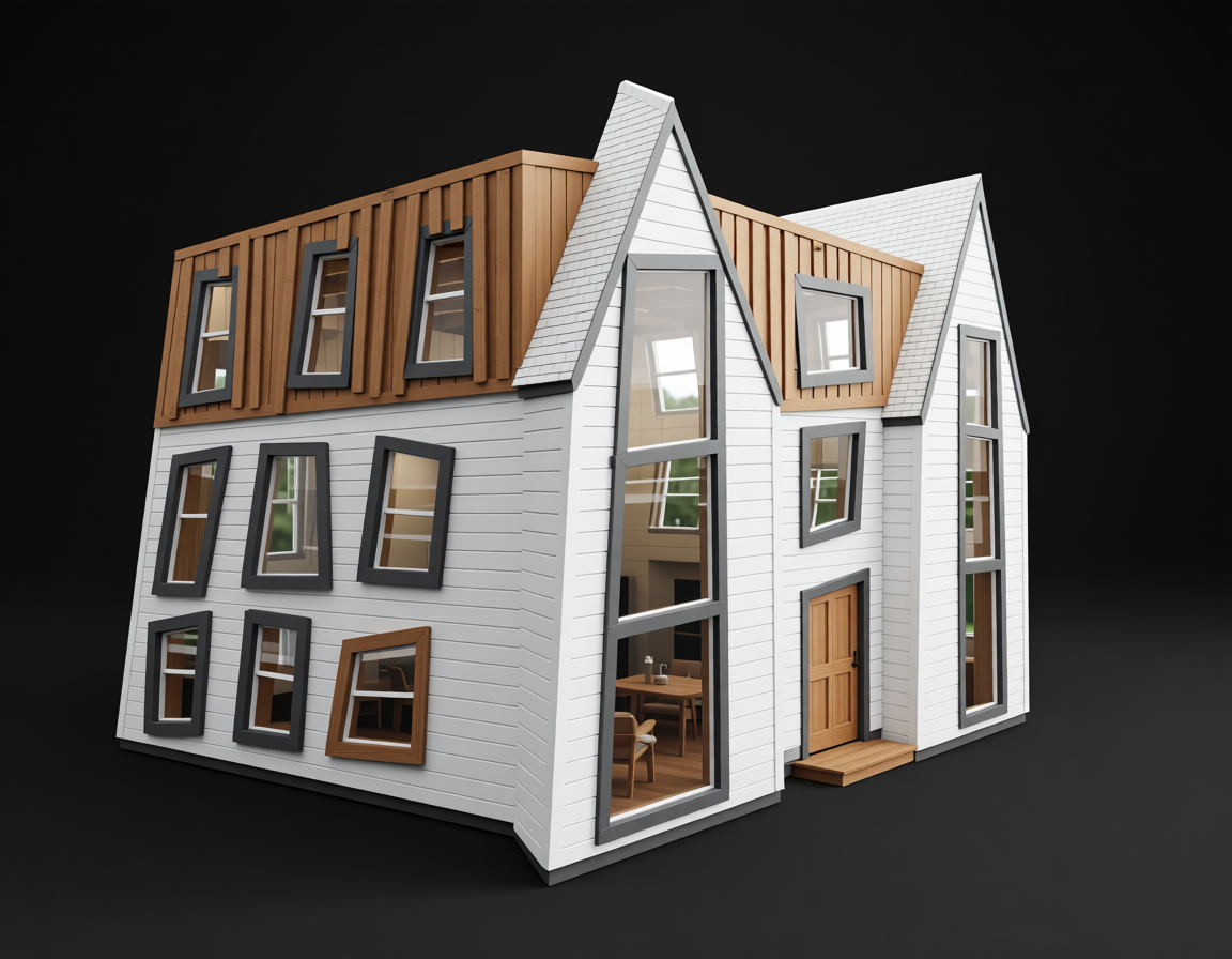 render this sketh into house with level and flush plumb straight walls brown should be vertical grey brown natural wood wide plank widow trim dark grey the rest white clabpbaord wood front door the gable should be white brickmake the 3rd floor except in gable all vertical grey brown natural wide plank wood