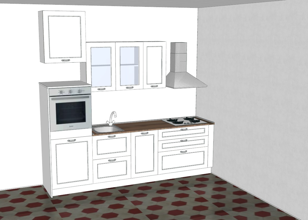 rende fotorealistico con illuminazione naturale il forno la cappa il piano cottura il lavello devono essere bianchi le maniglie sono argento con la ceramica bianca allinea le trame del pavimento che devono essere bianche color cotto ci sono solo due pensili vetrina centrali aggiungi qualche accessori d arredo e frigorifero a libera installazione vintage dopo il forno