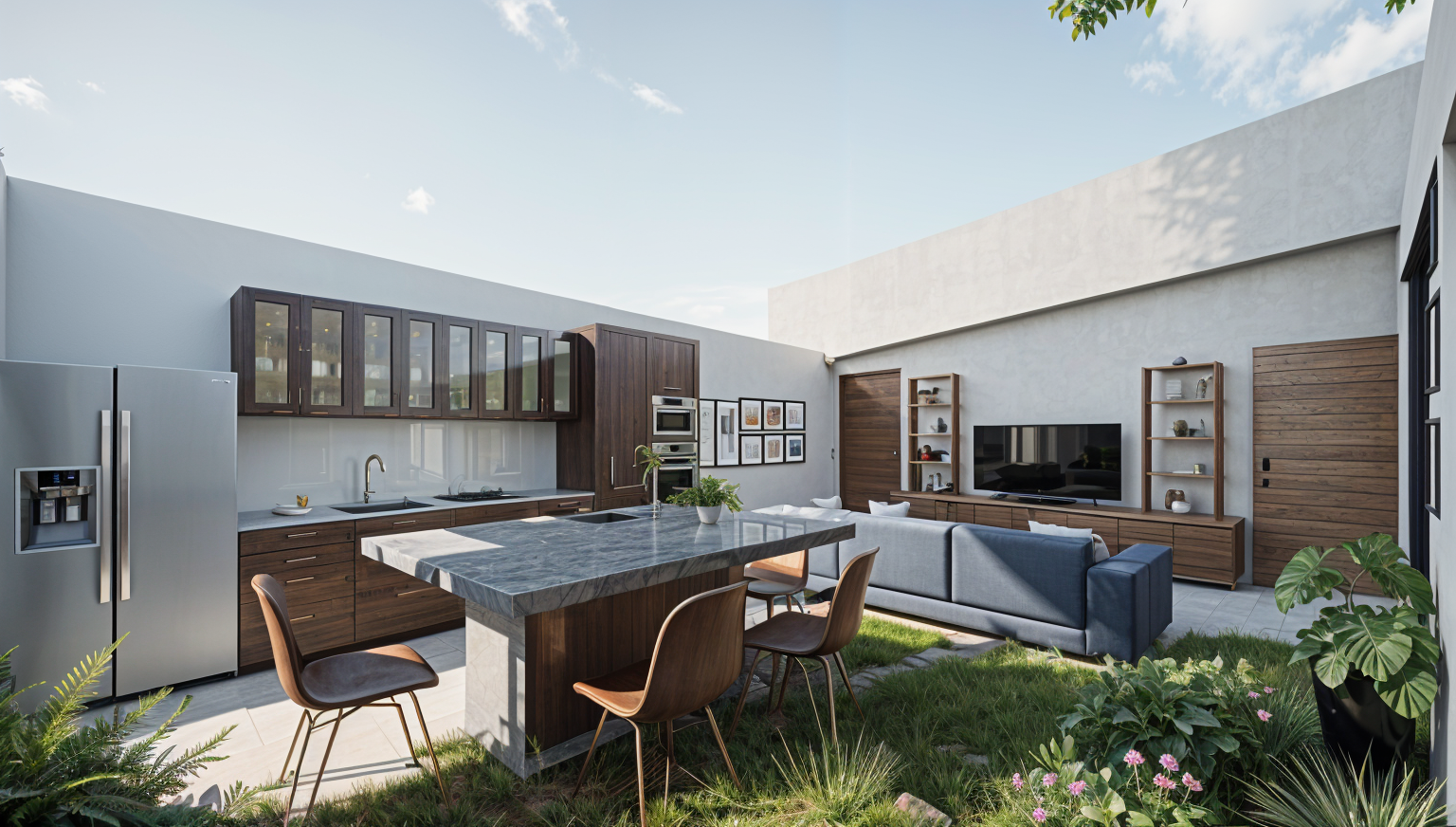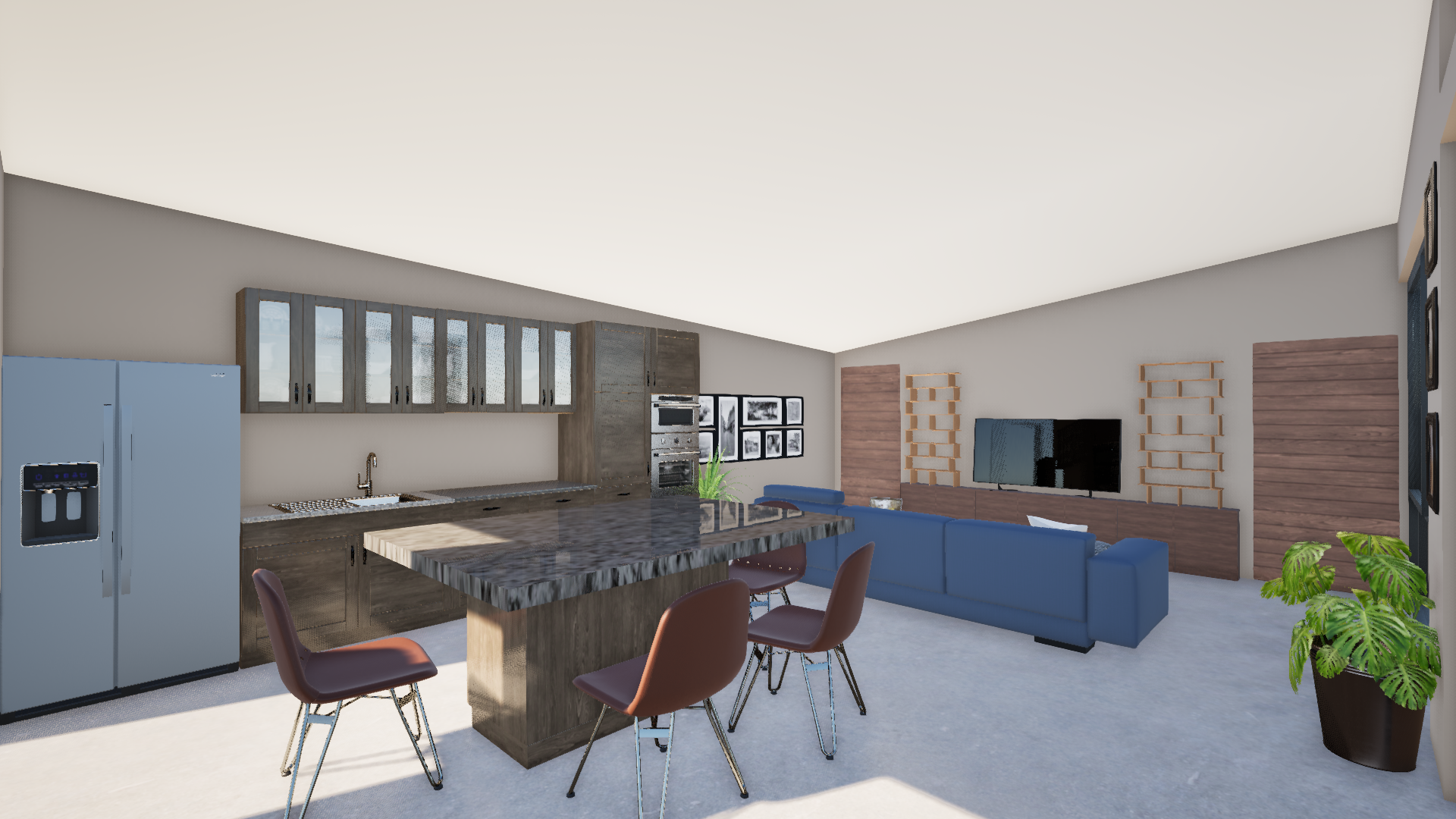 transform this interior kitchen and living room render into a refined wabi sabi style design emphasizing natural beauty imperfection and understated elegance create a calm minimalist atmosphere with warm muted earthy tones beige sand clay taupe warm grey avoid bright whites or high contrast the space should feel organic serene and timeless use natural materials with visible texture and imperfections limewash or clay plaster walls with subtle tonal variation light oak or smoked wood cabinetry with visible grain natural stone or textured concrete countertops handmade ceramic elements with slight irregularities linen or cotton upholstery in neutral tones textured woven rugs jute wool incorporate soft diffused natural lighting early morning or late afternoon sunlight with gentle shadows and warm highlights use realistic global illumination and soft ambient light no harsh artificial lighting furniture should be low profile simple and sculptural with rounded edges avoid glossy finishes prioritize matte raw and tactile surfaces add subtle curated decor a few handmade ceramic vases a single branch or dried foliage minimal open shelving with carefully spaced objects natural stone or wood coffee table light linen curtains with soft folds ensure photorealistic rendering with high detail textures pbr materials natural wear slight imperfections and realistic depth the final image should feel like a serene architectural photograph shot with a 35mm lens soft depth of field warm tones and a tranquil atmosphere the overall mood must feel peaceful grounded imperfect and beautifully simple true to authentic wabi sabi philosophy